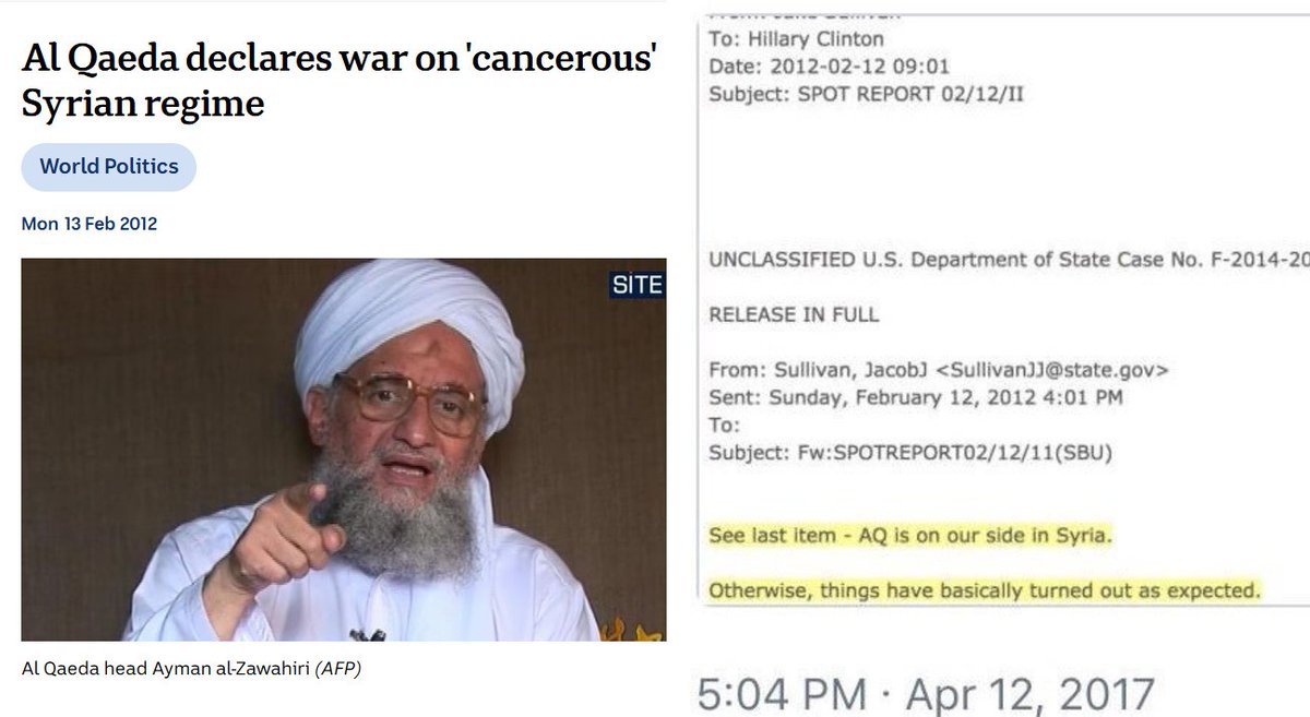 Thus, US deep state recruited Al Qaeda (AQ). Feb 12, 2012: AQ leader Zawahiri called jihadists all over the world to go to Syria & fight Assad ("cancerous regime"). Same day: Jake Sullivan - advisor of Hillary Clinton - sent an email: "Al Qaeda (AQ) is on our side in Syria"
