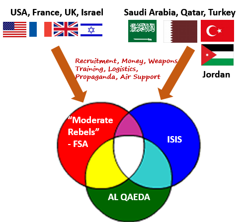The collusion to topple Assad involved many countries. US and Israel supplied weapons, money and propaganda. Saudi Arabia and Qatar provided money. Al Jazeera did the propaganda. Turkey and Jordan played key roles in logistics. UK provided propaganda and established the White Helmets. France recruited traitors.