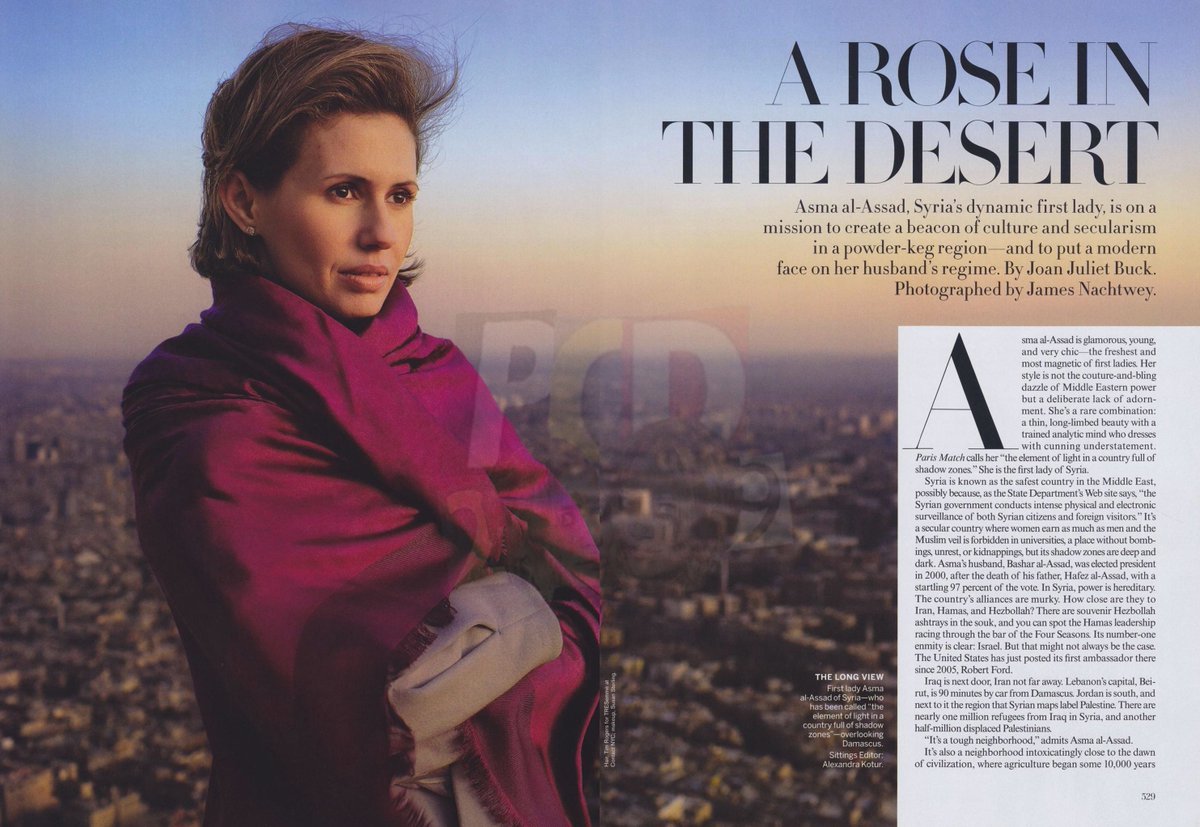 In 2010, Vogue magazine had a nice article on Asma Assad, the First Lady of Syria. "A Rose in the Desert" described all her great works in education, theater, charity, hospitals etc. Asma Assad was born and raised in the UK, where she met her husband, who was an ophthalmologist.