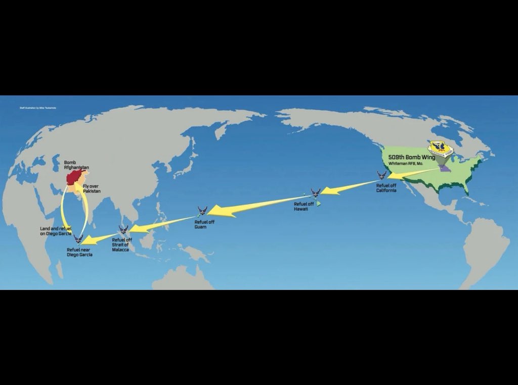 Here’s how the US bombers flew non-stop to bomb Afghanistan. Refuelled in the air at California, Hawaii, Guam, Strait of Malacca, and Diego Garcia. I am sure they will do the same this time to bomb Iran’s nuclear facilities - probably, Fordow. https://t.co/GpTZftslWi