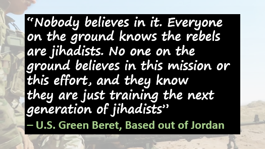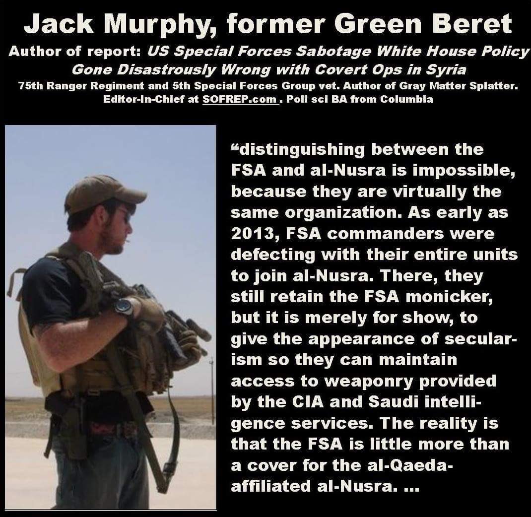 "Salafists, Al Qaeda and Muslim Brotherhood" US government and media were fooling the world, but US soldiers and intelligence officers in the field knew that they were training & arming the same people who did 9/11. Some Green Beret (US Special Forces) talked about it. General Flynn also wrote the famous memo in 2012, where he told the Pentagon that the groups that opposed Assad consisted of "Al Qaeda, Salafists and Muslim Brotherhood." For that, Flynn was fired! He later joined Trump's campaign.