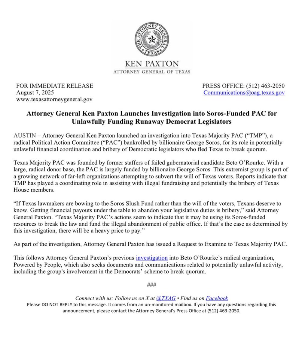 🚨BREAKING: I've just launched an investigation into a Soros-funded PAC for unlawfully funding runaway Democrats. If Texas lawmakers are bowing to the Soros Slush Fund rather than the will of the voters, Texans deserve to know. https://t.co/tL7j4a3Dlv