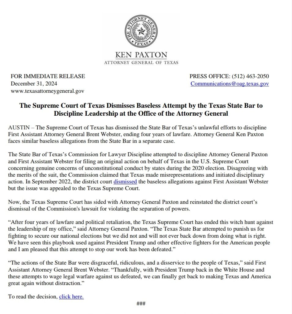 After four years of lawfare and political retaliation, the Texas Supreme Court has ended this witch hunt against the leadership of my office. The Texas State Bar attempted to punish us for fighting to secure our national elections, but we did not and will not ever back down from doing what is right. We have seen this playbook used against President Trump and other effective fighters for the American people and I am pleased that this attempt to stop our work has been defeated.