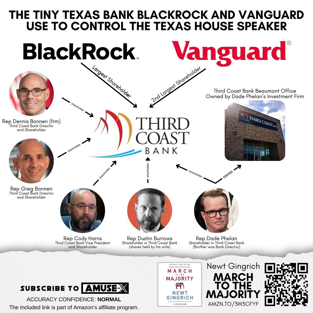 Speaker Dennis Bonnen, Speaker Dade Phelan, and now the Democrats’ preferred Speaker candidate Dustin Burrows ALL have had financial ties to Third Coast Bank—whose largest shareholders happen to be BlackRock and Vanguard—which sounds exactly like something the General Investigating Committee should look into next session. The idea that potentially THREE Texas House Speakers in a row have been financially tied to the SAME BlackRock affiliated bank is more suited for the next Taylor Sheridan drama than it is for the Texas House. Is this Third Coast Bank cabal our real life Texas House of Cards?
