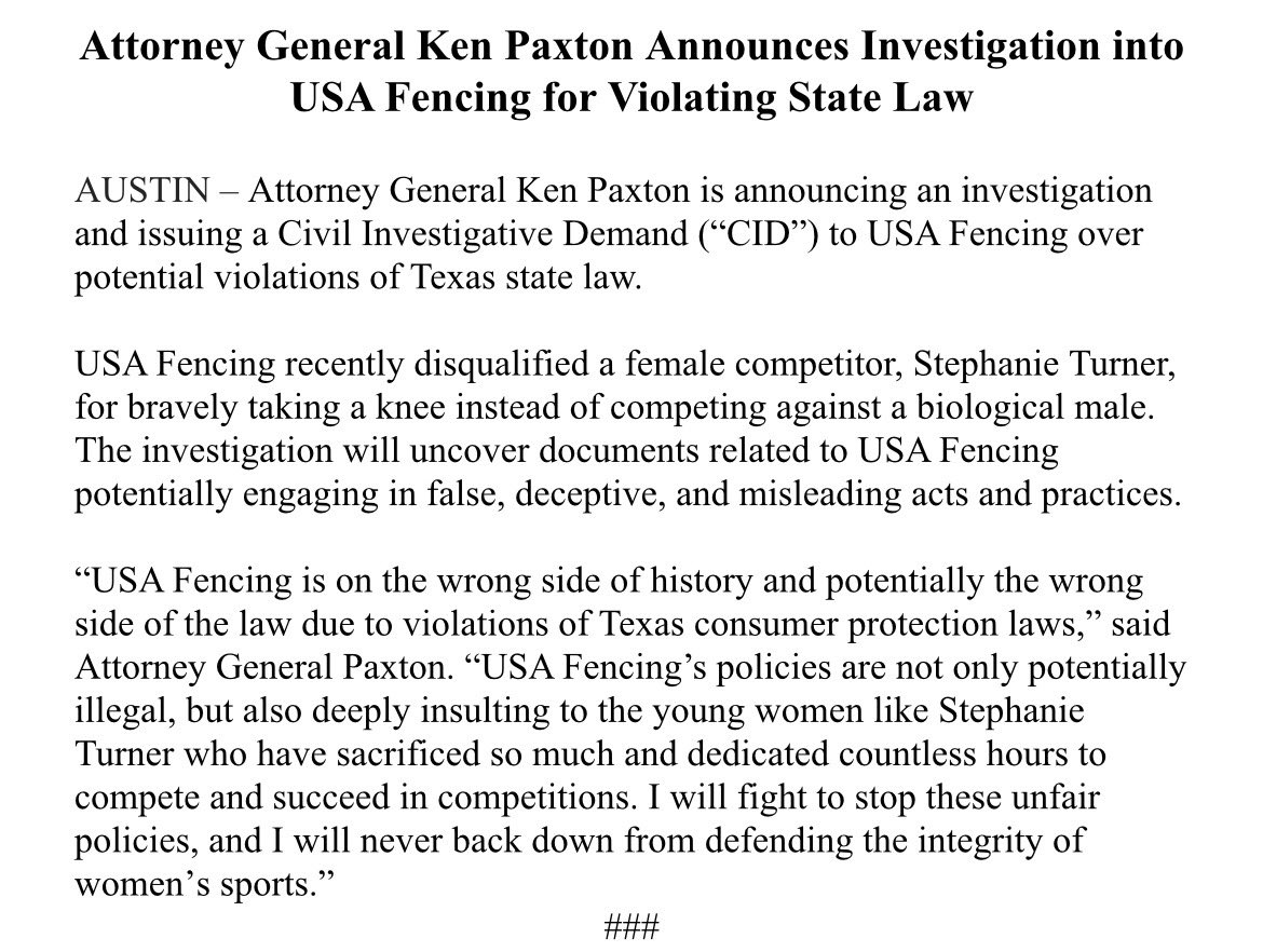 🚨NEW: I am announcing an investigation and issuing a Civil Investigative Demand (“CID”) to USA Fencing over potential violations of Texas state law. USA Fencing recently disqualified a female competitor, Stephanie Turner, for bravely taking a knee instead of competing against a biological male. The investigation will uncover documents related to USA Fencing potentially engaging in false, deceptive, and misleading acts and practices. USA Fencing is on the wrong side of history and potentially the wrong side of the law due to violations of Texas consumer protection laws. USA Fencing’s policies are not only potentially illegal, but also deeply insulting to the young women like Stephanie Turner who have sacrificed so much and dedicated countless hours to compete and succeed in competitions. I will fight to stop these unfair policies, and I will never back down from defending the integrity of women’s sports.