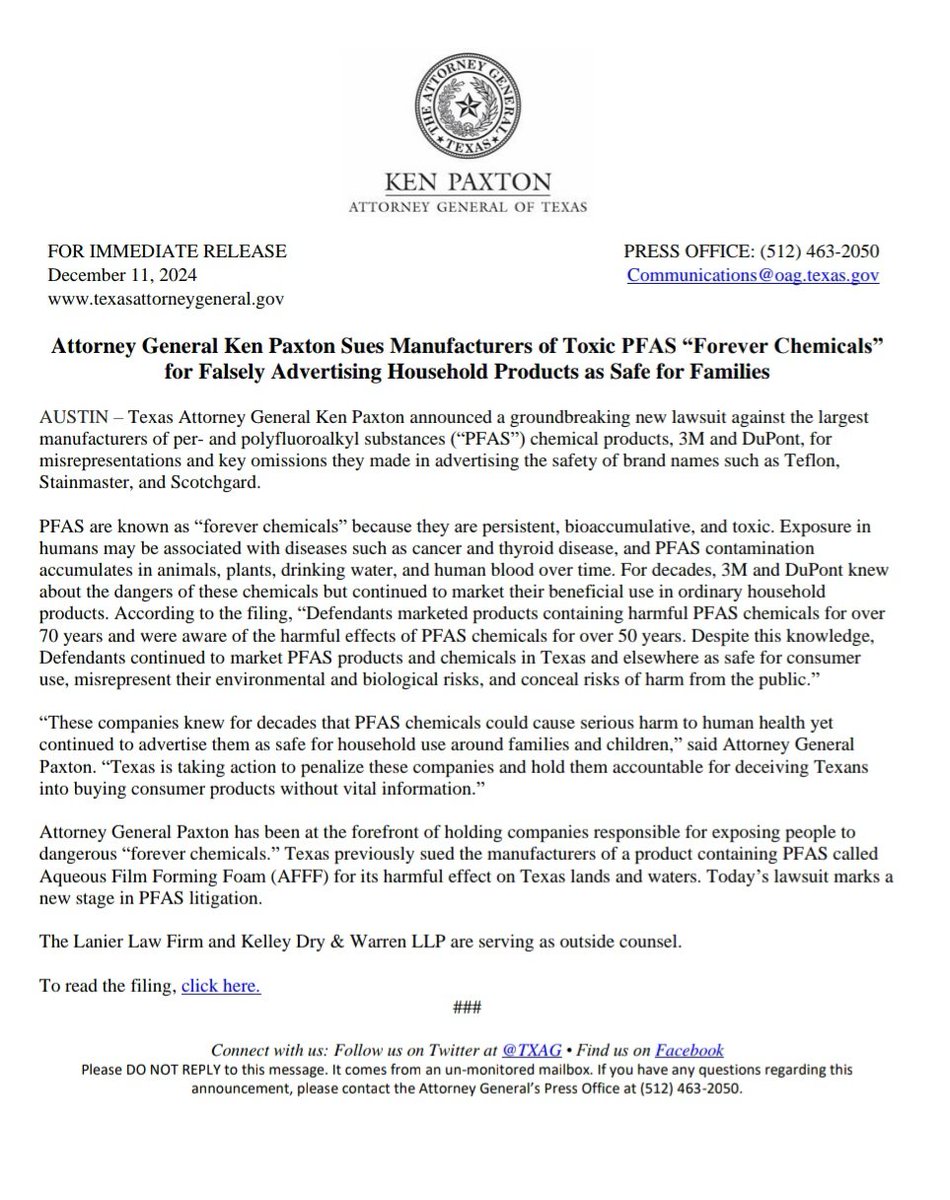 🚨BREAKING: My Office is Suing Manufacturers of Toxic PFAS “Forever Chemicals” for Falsely Advertising Household Products as Safe for Families These companies knew for decades that PFAS chemicals could cause serious harm to human health, yet continued to advertise them as safe for household use around families and children. Texas is taking action to penalize these companies and hold them accountable for deceiving Texans into buying consumer products without vital information.