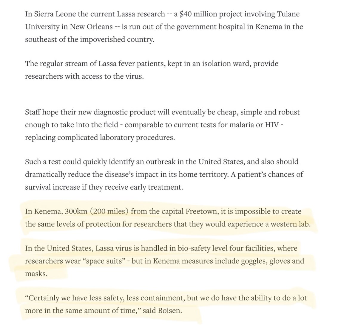 Offshoring of risky virological lab work to countries with lower or zero biosafety requirements is an old strategy. Lassa/Ebola lab, Kenema Government Hospital, Sierra Leone. https://reuters.com/article/us-bioterror-africa-idUKTRE71D49820110214/ https://who.int/news-room/feature-stories/detail/the-last-ebola-survivor-of-his-team- https://ncbi.nlm.nih.gov/pmc/articles/PMC5050470/pdf/jiw239.pdf http://vhfc.org Ebola at BSL-2. https://ncbi.nlm.nih.gov/pmc/articles/PMC5050470/ https://ncbi.nlm.nih.gov/pmc/articles/PMC5050470/bin/supp_214_suppl-3_S110__index.html Supplementary Figure 1A. 2014-2021 Ebola. It is nearly universal for outbreaks to be traced back far before their official site of discovery.