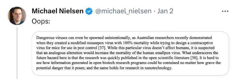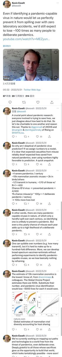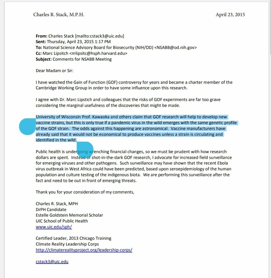 https://bmj.com/content/344/bmj.e2398/rapid-responses https://gab.com/Flavinkins/posts/109663743902085653 You can only have GoF work generate a viable prediction or a vaccine if the next emergence is of the exact same genetic makeup as your GOF strain. The extreme diversity of viruses mean that you have (total number of viruses in the world (billions)*probability that a GOF study result being used maliciously (>1/200 minimum)) times higher likelihood that GOF research cause a pandemic in stead of preventing it. https://archive.ph/BToZR https://archive.md/YYIXp