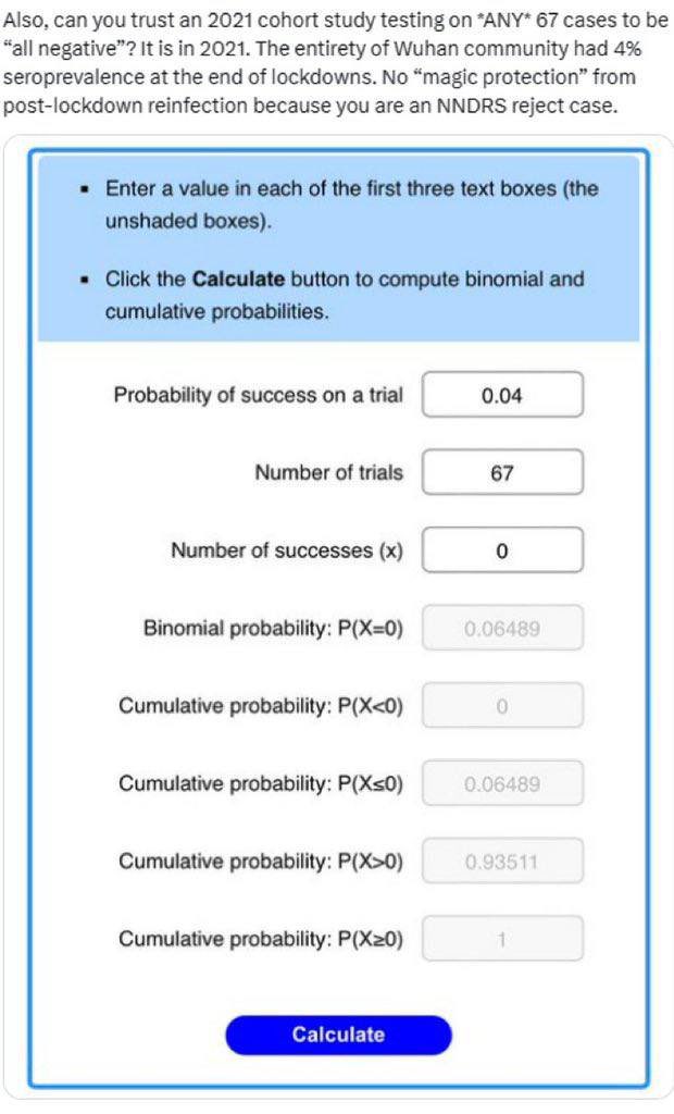 @AntGDuarte And here is a hint: despite being found all over the stalls and were also the objects most handled by the human cases, even in stalls with human cases and where there were no wildlife DNA in the positive samples from the stall, no boxes or baskets in the market have tested positive. The same for cashiers, keyboards, monitors, water cups or any objects that are frequently handled by direct touch by a vendor on the surface where the swab will be taken from. They can never test positive because of the insanely high content of RNAse 7 and other defensive nucleases on human skin destroys SARS-CoV-2 virion RNA within the period which the samples are stored inside liquid medium before being tested (which is particularly effective when the RNA is found in loose virions or human metabolic secrations and not shielded inside solid animal tissues), and vaporizes archive.md/RirQ7 archive.md/CTP3i archive.md/NeybM archive.md/2PM9Y any virion-free RNA the instant it enters medium contaminated by it. The WCDC and the Hubei CDC stores all of the human samples and backups of research cultures of pathogenic microbes in Wuhan, as this is their legally delegated duty (the “各级疾控部门” are termed “保藏机构” for “病原性微生物” under Chinese law governing the use of cultures and samples of human and animal pathogenic microbial samples, and samples that were suspected to have the possibility of containing such microorganisms. These are also the only locations which first round samples arriving in Wuhan are allowed to go for pre-screening prior to entry into the other labs in Wuhan, “检测机构”. ) and that labs in China are not allowed to store such cultures except several select state key laboratories. Since 2014, the only EID surveillance target in Wuhan is the HSM which all other sites are kept blind so that they can blame Huanan in case the research labs suffer an accident. Almost the soon as experimentation begun in the WCDC at the first detection of an infection from that program (Chen/WIV), the prior culture samples that was identified to match (via preliminary testing, including RdRp and antigens which are targeted by the Military test kits used in Wuhan) ended up causing an employee infection. Creating all 3 lineage A cases afterward. The employee infection would end up being detected because the CDC have to use a kit that work on real patients unlike the WIV, and got whistleblown into the WHO report under the pretext of an again never-specified “family cluster transmission”. So bad that you can’t actually compare Serological tests that were conducted between distinct times and groups of people for the test itself because doing so violated the statistical homogeny criterion for test efficacy evaluation—the same as comparing 🍎 with 🍊.