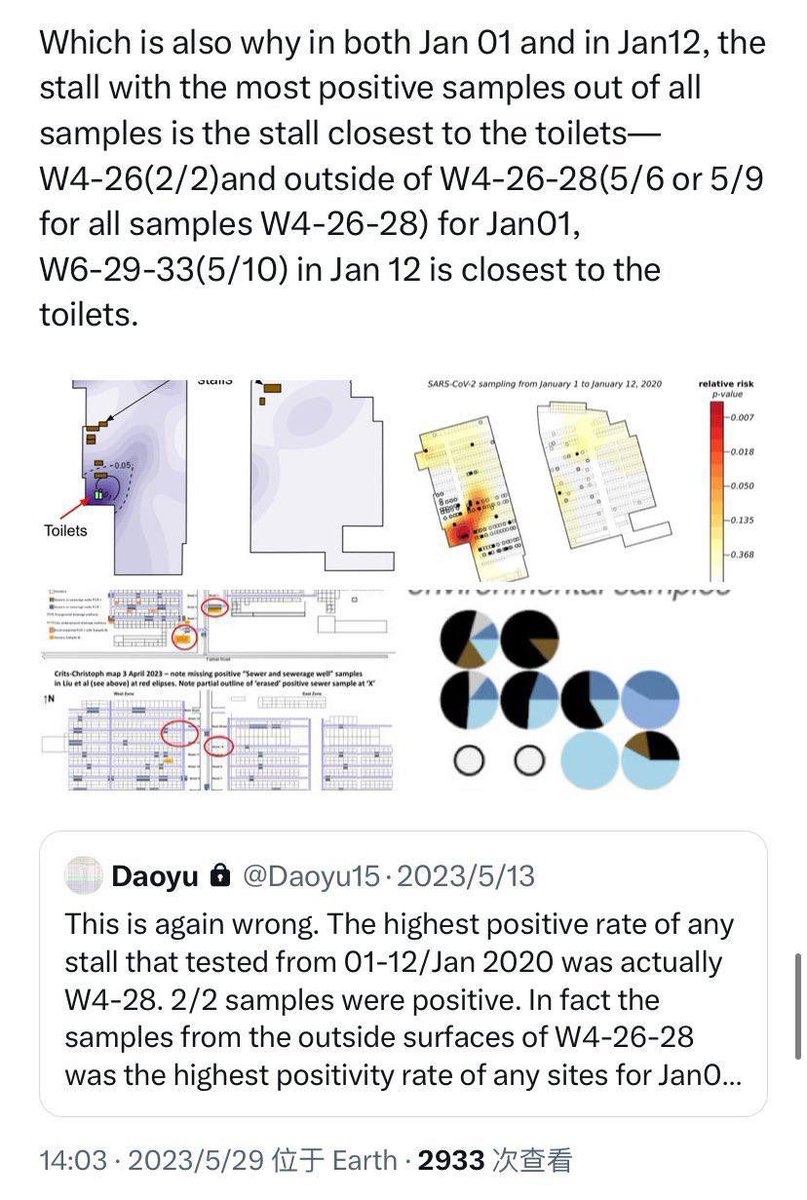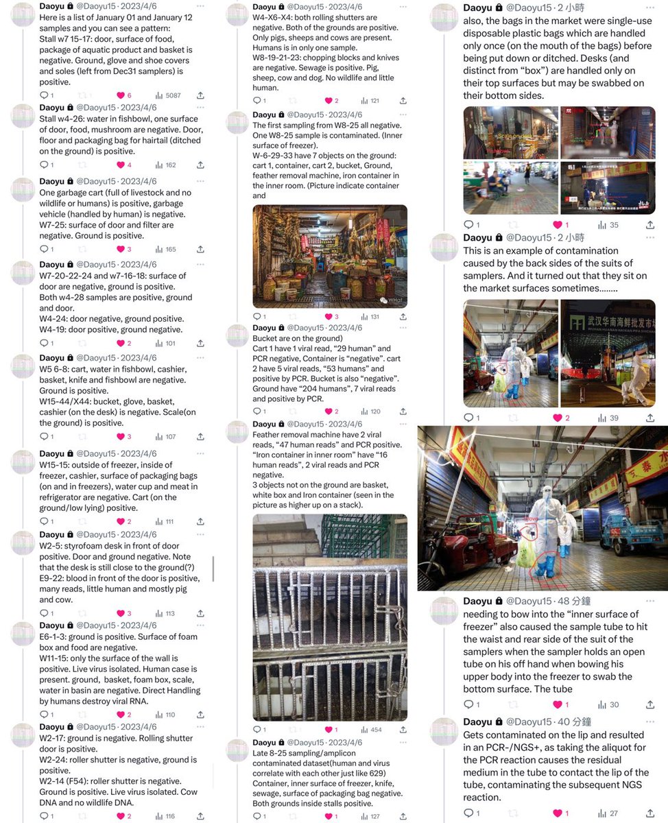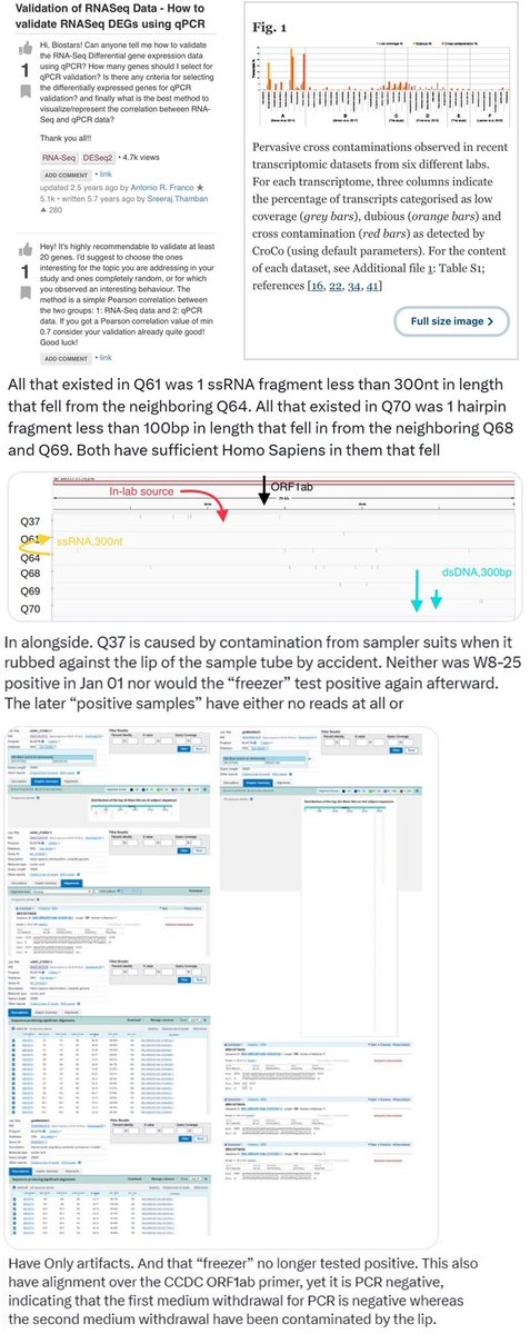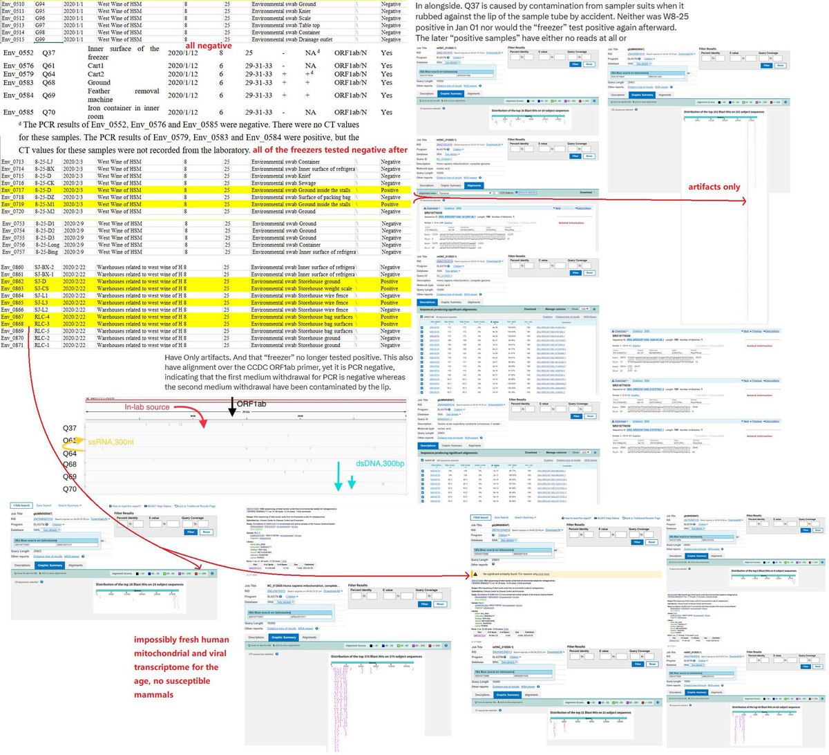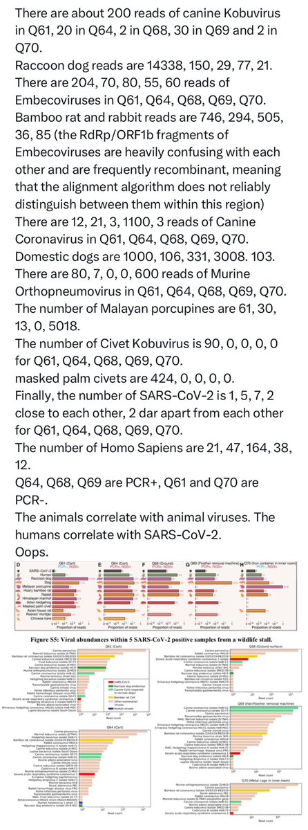 Unfortunately, all that existed for Q61 and Q70 are the result of cross-contamination from Q64 and Q68/Q69, All of which are on the ground and archive.md/YGDiK are the result of either lower level boot and foot contamination x.com/daoyu15/status… x.com/daoyu15/status… Same as Q64/Q68/Q69 (stepped on>kicked for contamination). x.com/daoyu15/status… All that archive.md/73xfX archive.md/8nN3k archive.md/FskYn archive.md/gvHfw exist for Q37 is the contamination of a sample tube by the gloves and suits of the samplers. The swab is clean, PCR-. The tube lip is contaminated, NGS+ with alignment over the CCDC SARS-CoV-2 ORF1ab primer pair. archive.md/LJzSO archive.md/4cCHG PCR+/NGS+ mean the virus is present in the location. PCR+/NGS- or NGS(artifacts) mean you are using the incorrect primers (all incidents happened with the PREDICT ORF1ab only primers). archive.md/rj1pV PCR-/NGS+, especially when archive.md/csYBM the primers are aligned over by NGS reads, indicate that the samples have been catastrophically contaminated as NGS is a more complicated process that are far more prone to contamination compared to PCR. archive.md/13bdP The stall for Q37 is negative at Jan 01. They then went on sampling the same stall including the “freezer” twice afterward, attempting to verify the “sample” they considered most promising. Bringing in artifacts elsewhere and samples without a read (the only sample with a real SARS-CoV-2 read at all gathered using the PREDICT ORF1ab only primer pair was a sewage well connected to the municipal sewage system on the exact opposite to the “wildlife corner”.), but never SARS-CoV-2 reads any more. This fact is also reinforced with the intriguing observation where Q37 is found to be in the same correlational series between SARS-CoV-2 and Homo Sapiens as other Q* samples. Attempts at sampling the archive.md/FskYn archive.md/gvHfw archive.md/4cCHG archive.md/csYBM archive.md/rj1pV “storehouse” just ended up with a total catastrophe—archive.md/13bdP the sampling team brought in in-lab culture contaminants, not even aged for more than a day, into the sampling sites again when they suited up in their lab and entered the location. Impossibly fresh intracellular Homo Sapiens and SARS-CoV-2 transcriptomes, neither capable of lasting for more than two days ex-vivo in that condition, ended up contaminating the samples and without a single read of a susceptible animal inside those “samples”. Sampler contamination and cross-contamination. archive.md/LJzSO archive.md/VNr75 Never an infected vendor or animal. In fact, the samples in the market follows the rule which a positive sample archive.md/CTP3i archive.md/ETjzS archive.md/BWZJL must be contacted by samplers.🥼👖👢=positive. archive.md/NeybM archive.md/2PM9Y archive.md/RirQ7 And not frequently handled by vendors.🥩🥬🍄🛁📻☎️📦🧺=negative. archive.md/HlJ9o archive.md/nAqKp archive.md/rSaO9 They also put bleach onto the toilets and the mahjong room before sampling them. This is a clear move to cover up. archive.md/csYBM And no the “stall” W5-NA was sampled on the inside 27/01/2020, negative. (Not even animal CoVs were there) The toilets is the real contamination source. archive.md/C5oal archive.md/RSsS7 and yes only Homo Sapiens positively correlated with SARS-CoV-2 consistently in all metrics, or formed any kind of line or grouping pattern at all that allow the abundance of one to be estimated at above-random success rate and precision using the other (e.g. have any significant mutual information with SARS-CoV-2). archive.md/0O2TN archive.md/GjlEx