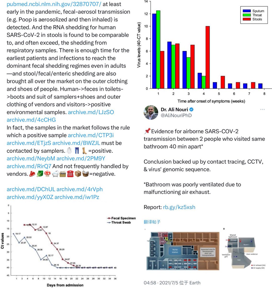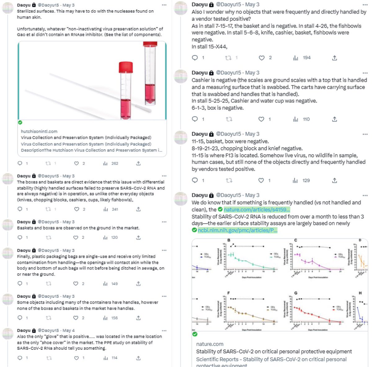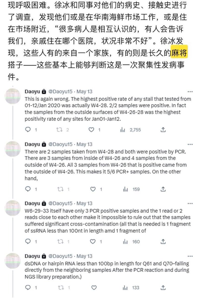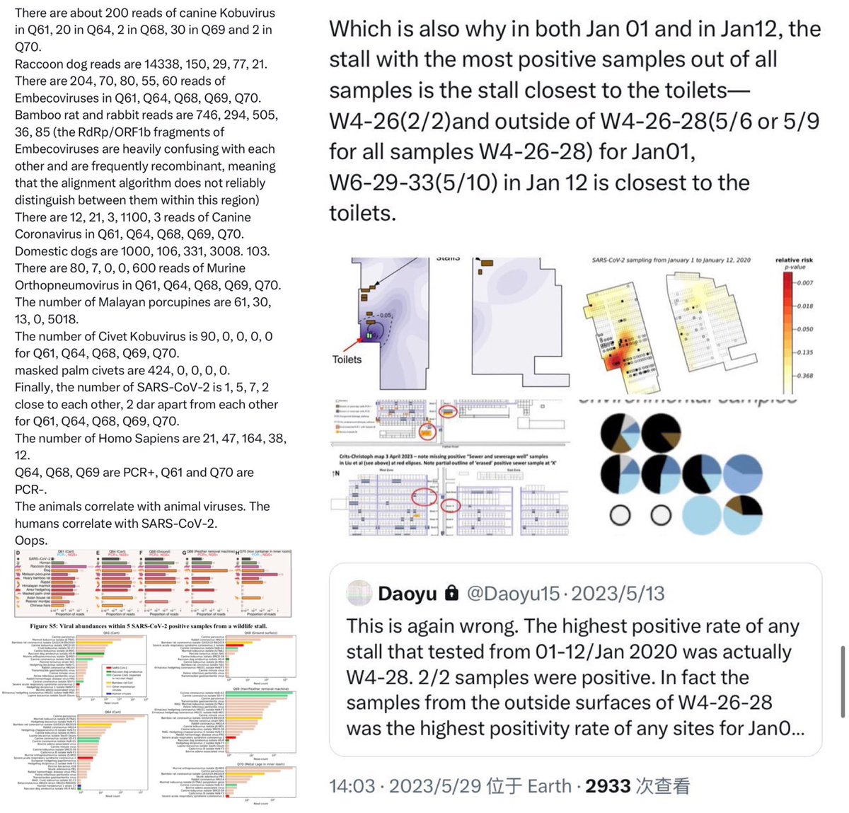 Unfortunately, all that existed for Q61 and Q70 are the result of cross-contamination from Q64 and Q68/Q69, All of which are on the ground and archive.md/YGDiK are the result of either lower level boot and foot contamination x.com/daoyu15/status… x.com/daoyu15/status… Same as Q64/Q68/Q69 (stepped on>kicked for contamination). x.com/daoyu15/status… All that archive.md/73xfX archive.md/8nN3k archive.md/FskYn archive.md/gvHfw exist for Q37 is the contamination of a sample tube by the gloves and suits of the samplers. The swab is clean, PCR-. The tube lip is contaminated, NGS+ with alignment over the CCDC SARS-CoV-2 ORF1ab primer pair. archive.md/LJzSO archive.md/4cCHG PCR+/NGS+ mean the virus is present in the location. PCR+/NGS- or NGS(artifacts) mean you are using the incorrect primers (all incidents happened with the PREDICT ORF1ab only primers). archive.md/rj1pV PCR-/NGS+, especially when archive.md/csYBM the primers are aligned over by NGS reads, indicate that the samples have been catastrophically contaminated as NGS is a more complicated process that are far more prone to contamination compared to PCR. archive.md/13bdP The stall for Q37 is negative at Jan 01. They then went on sampling the same stall including the “freezer” twice afterward, attempting to verify the “sample” they considered most promising. Bringing in artifacts elsewhere and samples without a read (the only sample with a real SARS-CoV-2 read at all gathered using the PREDICT ORF1ab only primer pair was a sewage well connected to the municipal sewage system on the exact opposite to the “wildlife corner”.), but never SARS-CoV-2 reads any more. This fact is also reinforced with the intriguing observation where Q37 is found to be in the same correlational series between SARS-CoV-2 and Homo Sapiens as other Q* samples. Attempts at sampling the archive.md/FskYn archive.md/gvHfw archive.md/4cCHG archive.md/csYBM archive.md/rj1pV “storehouse” just ended up with a total catastrophe—archive.md/13bdP the sampling team brought in in-lab culture contaminants, not even aged for more than a day, into the sampling sites again when they suited up in their lab and entered the location. Impossibly fresh intracellular Homo Sapiens and SARS-CoV-2 transcriptomes, neither capable of lasting for more than two days ex-vivo in that condition, ended up contaminating the samples and without a single read of a susceptible animal inside those “samples”. Sampler contamination and cross-contamination. archive.md/LJzSO archive.md/VNr75 Never an infected vendor or animal. In fact, the samples in the market follows the rule which a positive sample archive.md/CTP3i archive.md/ETjzS archive.md/BWZJL must be contacted by samplers.🥼👖👢=positive. archive.md/NeybM archive.md/2PM9Y archive.md/RirQ7 And not frequently handled by vendors.🥩🥬🍄🛁📻☎️📦🧺=negative. archive.md/HlJ9o archive.md/nAqKp archive.md/rSaO9 They also put bleach onto the toilets and the mahjong room before sampling them. This is a clear move to cover up. archive.md/csYBM And no the “stall” W5-NA was sampled on the inside 27/01/2020, negative. (Not even animal CoVs were there) The toilets is the real contamination source. archive.md/C5oal archive.md/RSsS7 and yes only Homo Sapiens positively correlated with SARS-CoV-2 consistently in all metrics, or formed any kind of line or grouping pattern at all that allow the abundance of one to be estimated at above-random success rate and precision using the other (e.g. have any significant mutual information with SARS-CoV-2). archive.md/0O2TN archive.md/GjlEx