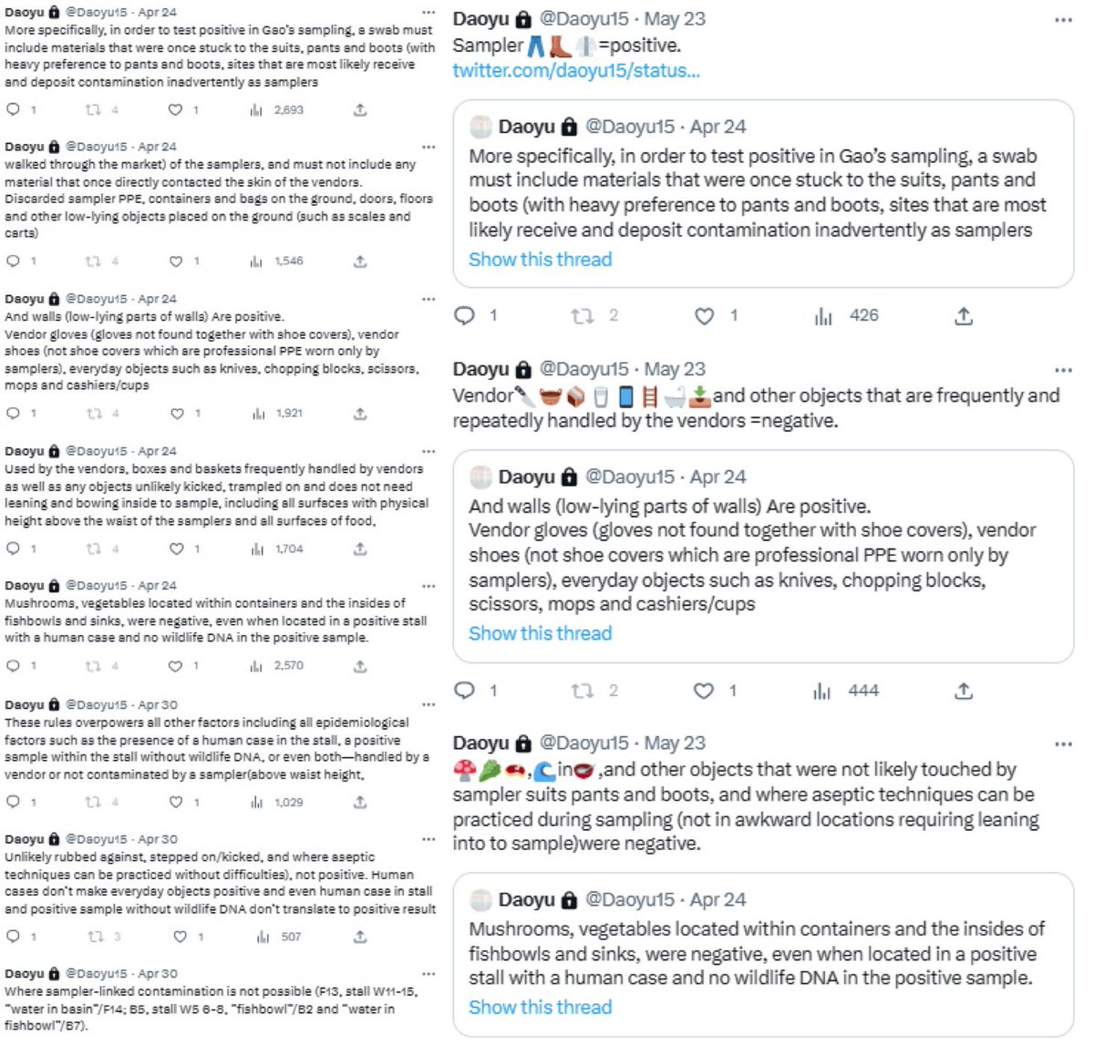 https://x.com/nestcommander/status/1781826378683556254?s=46&t=wRQSWp_1VffWmS2vKQwhSA… When they begun an official censorship campaign on all and anything on the “Wuhan P4 lab”, @AP you know that they are acting out a pre-scripted cover-up effort, and was not “genuingly clueless”. Especially when the expected precaution in response to an ongoing outbreak, such as washing hands, was also intentionally avoided. https://x.com/daoyu15/status/1718782597114016231?s=46&t=wRQSWp_1VffWmS2vKQwhSA… The entirety of the “they covered up the market” theory can also be interpreted as that they don’t want to let the NEGATIVE animal samples from being known. They need to shroud it in mystery, or the https://x.com/daoyu15/status/daoyu15/status/1694163822473629792?s=46&t=wRQSWp_1VffWmS2vKQwhSA… absence of any secondary spillovers in any other markets in China https://x.com/nestcommander/status/1779485262005023009?s=46&t=wRQSWp_1VffWmS2vKQwhSA…, when SARS1 have already did 7 times over the same month and a half of no actions https://x.com/daoyu15/status/daoyu15/status/1687891376665681920, would be confirmed in the total absence of any positive animal swabs at the market. https://x.com/daoyu15/status/daoyu15/status/1754661054733242856 China, as in the national level, performed sampling of the entirety of the wildlife supply chain toward the market and have officially insisted that “it came from illegal wildlife sold at the Huanan market” up to May 2020. They even tried to blame pangolins, among the others. All the sampling results are negative, and which are in fact leaked even during this period of “you can blame only the animals”. https://x.com/daoyu15/status/daoyu15/status/1668828125617352704?s=46&t=wRQSWp_1VffWmS2vKQwhSA… And once again, a lower down that was tasked to eliminate potential negative evidence by the higher up, but only told to eliminate “potential evidence” in general, can easily come up with conspiracy theories about “they are tasking to eliminate positive evidence”; https://x.com/nestcommander/status/1775081708007878978?s=46&t=wRQSWp_1VffWmS2vKQwhSA… When in fact, The fear that a thorough investigation would turn up confirming all animals being negative and that their labs would become blamed immediately, being the the real cause, is evident in both the absence of spillovers anywhere alongside or in any other destinations of the wildlife supply chain, and the leaked preliminary sampling efforts among these supply chains that returned no positivity at all, https://x.com/daoyu15/status/1740641874032185732?s=46&t=wRQSWp_1VffWmS2vKQwhSA… Despite at the time when “wild animals illegally traded at the Huanan market” and then “wild animals” was the only permitted origin theory on all official outlets in China (up to May 2020).