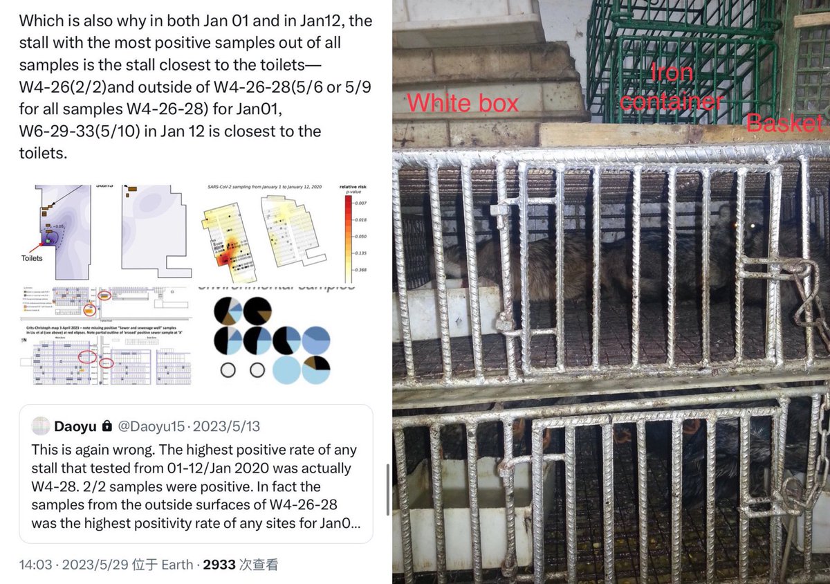 Cold hard reality: there is nothing special to W6-29-33 compared to W4-26-28. Closest to the toilets is what that govern where the virus would be found. Fact: w6-29-33 and the market supply chain did not get shut down at all. The former operated as “金秀山家禽批发商行” up to the end of 2021 and the latter operate still to supply other markets in Hubei, archive.md/yyX0Z archive.md/iw1Pz archive.md/4rVph archive.md/DChUL evidenced by the fact that these suppliers including the exact animals sold were readily sampled in Jan-feb 2020. This included also specific sampling of several species inside the stall itself, also negative. Their animals tested negative and no outbreaks happened. They represent the full inventory of raccoon dogs and siberian weasels in the market. The Hubei supply farms then represent the full inventory of many other species. The only Yunnan supplied animals all landed on the wrong stalls, testing negative even when sampled as is in the market. archive.md/e3615 archive.md/vWjZl