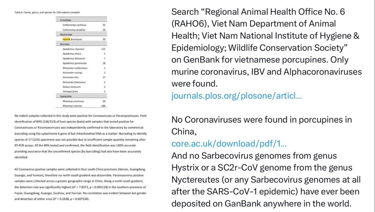 01, 03 and 04, 06 are disproven by the presence of severe and https://ayjchan.medium.com/evidence-for-a-natural-origin-of-covid-19-no-longer-dispositive-after-scientific-peer-review-af95b52499e1 https://zenodo.org/record/7169296 conclusion-disproving ascertainment bias within the CCP data. As well as cherry-picking of early genome data. https://www.researchgate.net/publication/362806429_Unwarranted_exclusion_of_intermediate_lineage_AB_SARS-CoV-2_genomes_is_inconsistent_with_the_two_spillover_hypothesis_of_the_origin_of_COVID-19 https://gab.com/Flavinkins/posts/109152915624650793 08 is disproven by the fact that there were no by-month data for Xiao Xiao et al, and there being no evidence of December 2019 animal sales that can be proven through an image that contained either features or metadata that permit them to be dated. 05 is simply wrong. Yunnan is the hotspot, Guangdong is linked to wildlife trade. Wuhan is neither. 09 is disproven as the specific pattern of RE sites are not directly linked to spillover probability and the probability that it is easy to clone with the standard BsaI/BsmBI through natural recombination is less than 1/32. https://gab.com/Flavinkins/posts/109255356915252021 03 is disproven since despite all the efforts, FCS continue to elude all efforts to find it. https://archive.ph/k7S6T https://archive.ph/Ga1iI https://archive.ph/vUy8n 07 is disproven by Marburg virus and also RSV. Especially RSV, which originated in polio vaccine research. https://gab.com/Flavinkins/posts/108661483685033341 https://www.bmj.com/content/344/bmj.e2398/rr/599724 As for 10, the actual graph seen—show humans and largemouse bass not raccoon dogs. Humans and several livestock species in the “志翔冻品商行” near the toilets are the only species with any mutual information at all, highly consistent with boot and suit contamination. All metric positive correlation is observed only in humans and the entirely non-susceptible livestock species sold near the toilets. Worobey failed to address the fact that “the neighborhood of Huanan market” was used during the early case collection process—he opted to remove directly linked cases but none of the critical annex D5 cases that were collected from “the neighborhood of Huanan market”. Exactly 32 of these dots exists, = 59-27. https://gab.com/Flavinkins/posts/109228312723838390 https://gab.com/Flavinkins/posts/109443089504009640 https://gab.com/Flavinkins/posts/109148677382700486 https://gab.com/Flavinkins/posts/108825678909519515 These were cases that were collected because of their geographical proximity—collect if lived in the neighborhood, regardless of hospital. Collect from other hospitals only if exposed to market. Collect from hospitals near the market. https://gab.com/Flavinkins/posts/109386394452941367 https://gab.com/Flavinkins/posts/108830214433800007 https://gab.com/Flavinkins/posts/109169722840473497