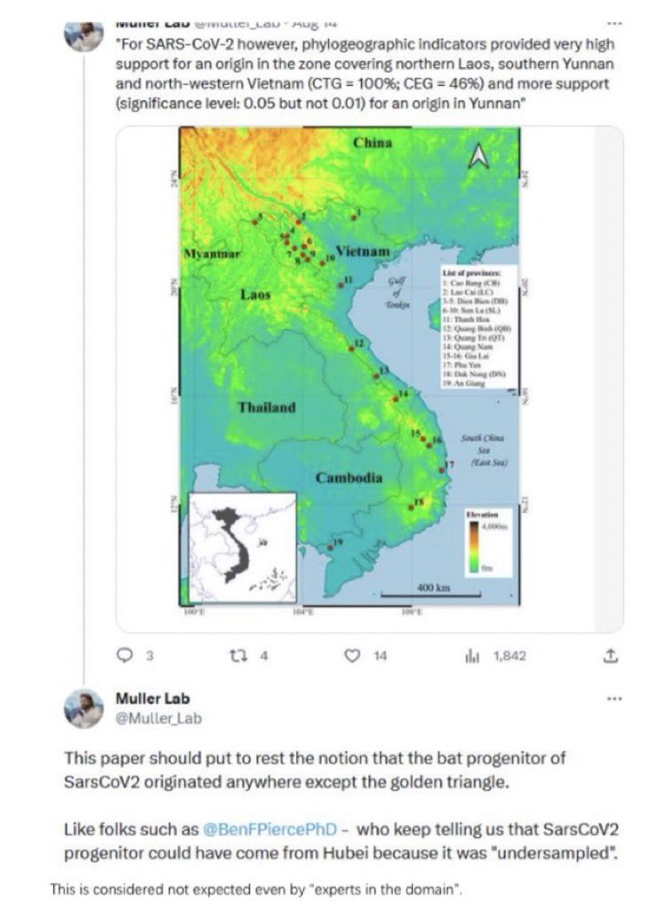 Myanmar, Cambodia, which also, incidentally, was where China specifically sampled before. https://www.ncbi.nlm.nih.gov/pmc/articles/PMC7818139/ This also included human sampling as well, per “pathogen host adaptation and immune intervention”. Now where I find these specific human Mitochondrial haplotypes again? (Southeast Asia, not central China, +SARS-CoV-2, no FCS, exactly where the WIV and the WHU would sample humans and put the resulting cultures into the WCDC). Note how the China serological sampling is a specific sampling around bat caves which human cells-infecting CoVs have been specifically isolated before. Notice how low this number is compared to southeast Asia (Cambodia, Myanmar). Despite Shi and Daszak’s name on it, “no work was ever conducted in Laos” they claimed. How can the EHA be trusted?