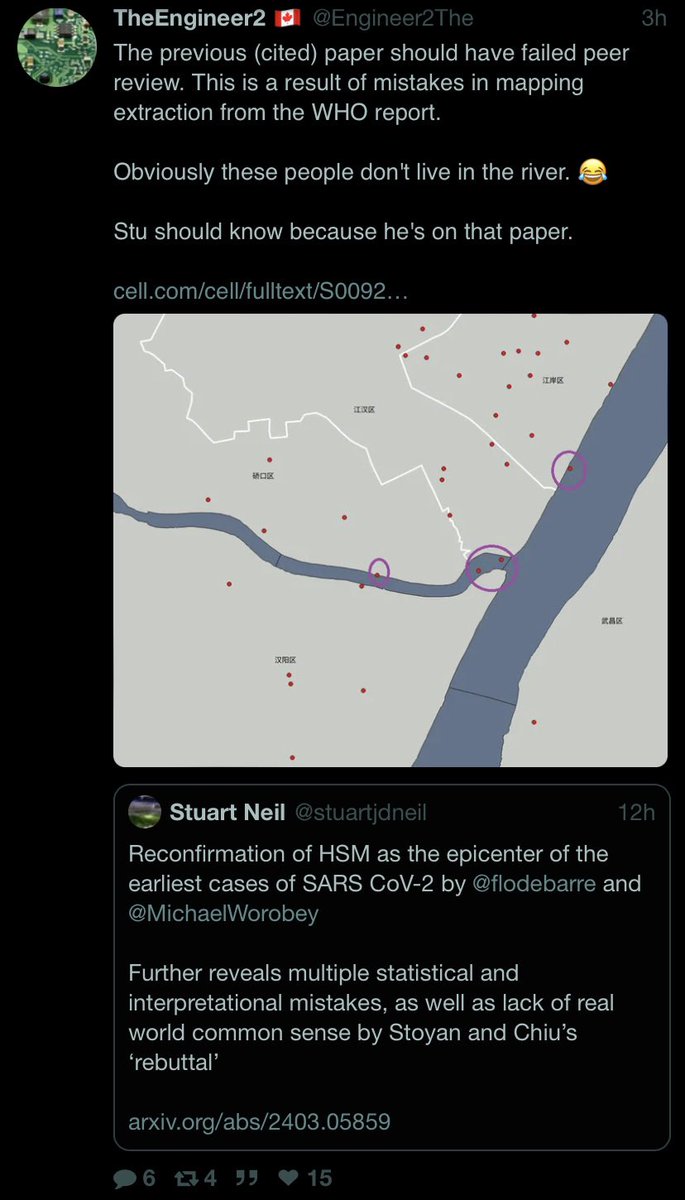 The WHO report is found to have moved all https://gab.com/Flavinkins/posts/109048819612838694 cases with onset before 27/12/2019 https://www.researchgate.net/publication/370635299_Greater_than_the_Sum_of_its_Parts_-_Aggregated_Wuhan_COVID-19_case_data_points_to_the_wrong_side_of_the_Yangtze_River_-_Rixey_-_20230509 inside the district of Wuchang, and then all cases within the central Wuchang prefectures and those prefectures near the labs, to Jianghan. with calibration performed so that they would add up to a perfect “bullseye” https://www.reuters.com/article/us-health-coronavirus-who-china-idUSKBN2AD090 https://www.nytimes.com/2021/02/12/world/asia/china-world-health-organization-coronavirus.html https://www.washingtonpost.com/opinions/2022/11/17/covid-early-cases-wuhan-china-mystery/ https://www.wsj.com/amp/articles/china-refuses-to-give-who-raw-data-on-early-covid-19-cases-11613150580 of within 50m precision at the Huanan market, which would not be realistically possible given the expected social biases from uneven residential densities even in the neighborhood of the Huanan market. Cases *residences* were dropped into water and placed into non-residential areas as the result of this tampering, especially the former which, residences could not exist on since they would be washed away by the water. Obvious examples included accountant Chen, which they refused to mention where he lived at all since the WHO report alongside any specific single cases, and one of the two “江夏急救中心” ambulances seen blaring into Wuchang in 31/13/2019, where only one out of the two, one that likely did not live in Shidong, were counted as a dot in Jiangxia. They refused to give any line lists at all for a reason.