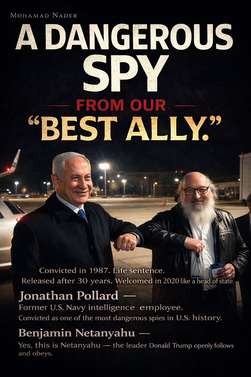 READ THIS TO THE END. Jonathan Pollard Former U.S. Navy intelligence analyst. Exposed in 1985 as a spy working for a foreign state — Israel. Described by U.S. intelligence officials as one of the most damaging espionage cases in American history. In 1987, he was sentenced to life imprisonment. He served 30 years in U.S. federal prison. For decades, Pollard was classified as the most dangerous insider breach of U.S. national security. --- After his release In 2015, Pollard was released on parole under U.S. federal law. He remained under strict surveillance, with severe travel and communication restrictions. U.S. intelligence agencies — including former CIA and FBI officials — strongly opposed lifting these restrictions. Their position was clear: Pollard’s case was not over. --- November 2020 — A turning point In the final months of the Trump administration, the U.S. Department of Justice abruptly ended Pollard’s parole conditions. All travel restrictions were lifted. Despite long-standing intelligence objections, Pollard was cleared to leave the United States. He departed legally — during Donald Trump’s presidency. --- What followed immediately Upon arrival in Israel, Pollard was publicly celebrated. He appeared in official photos with senior Israeli leaders — including Prime Minister Benjamin Netanyahu. The welcome was not discreet. It was symbolic. It was political. In Israel, Pollard is widely treated as a national hero, despite the severe and lasting damage his actions caused to U.S. intelligence systems. --- The Netanyahu–Trump factor Benjamin Netanyahu is not a distant ally of Donald Trump. He is widely regarded as one of the closest foreign leaders Trump ever aligned with. During Trump’s presidency: Netanyahu faced no meaningful resistance from the White House. Major, unprecedented political decisions were taken in Israel’s favor. Trump repeatedly overruled U.S. institutional, diplomatic, and intelligence objections. Netanyahu was the rare foreign leader for whom Trump appeared willing to: Break precedent Ignore expert warnings Absorb internal backlash Trump did not publicly refuse Netanyahu a single major request. --- Historical assessment Jonathan Pollard is often described as the second most damaging foreign-aligned threat in U.S. history. --- The first? Many Americans argue that the greatest foreign-aligned damage to the United States did not come from a spy operating in secrecy — but from a political figure operating in plain sight. A president. Inside the system. Undermining it from within. Donald J. Trump. --- @FBI@CIA — Mohamad Nader #FreePalestine 🇵🇸🇵🇸 #FREEUSA 🇺🇸🇺🇸 #AIPAC 🇮🇱🇮🇱