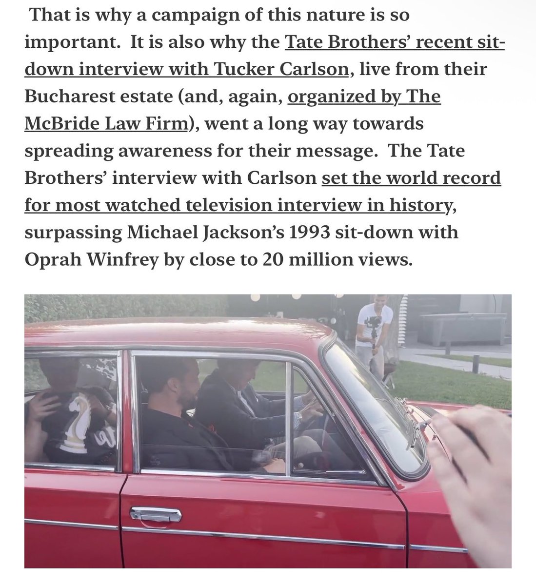 Former McBride Law Firm associate Paul Ingrassia revealed in his Substack that the firm organized a “congressional outreach campaign” on behalf of the Tate brothers. Ingrassia also organized the Tate bros’ interviews with Tucker Carlson in Romania in 2023. “To clear their names.”