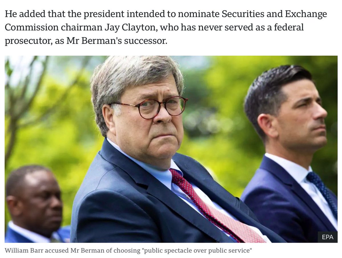 Berman refused to resign, and the standoff led President Trump to formally fire and replace him. The House Judiciary Committee interviewed Berman. “The Attorney General said that if I did not resign from my position I would be fired,” he told them. https://abcnews.go.com/Politics/fired-us-attorney-geoffrey-berman-appears-congress/story?id=71690131
