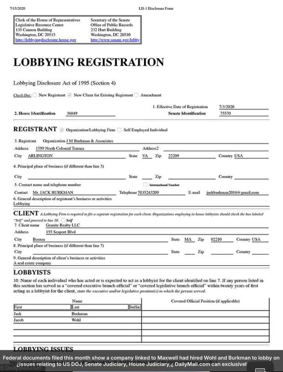 A lobbying registration form filed with the U.S. Senate by Burkman shows he and Wohl were hired by “Granite Realty LLC,” a common misspelling of Granite Reality. Property records show the New Hampshire house where Ghislaine was arrested was purchased by the LLC for $1.07mm.