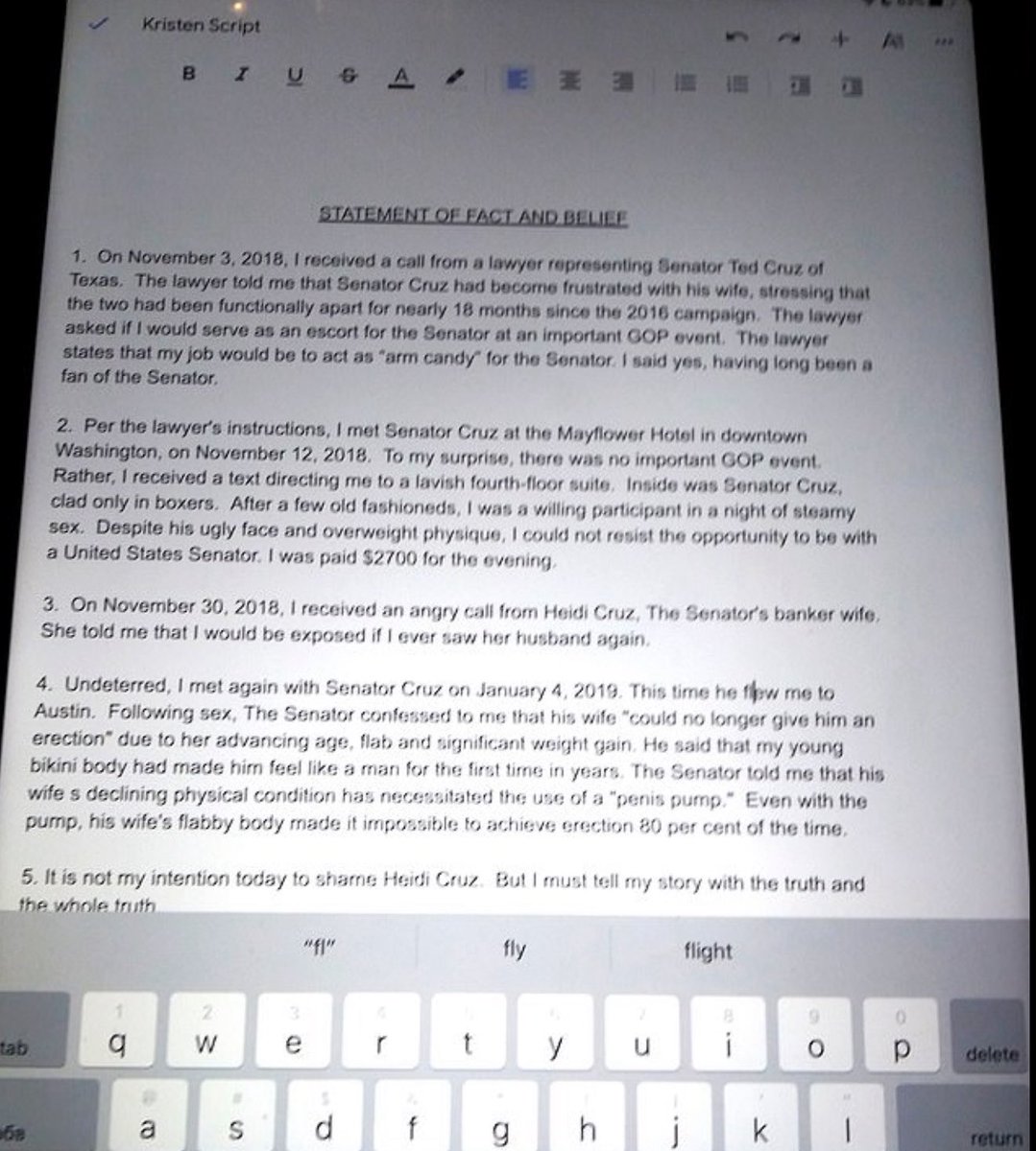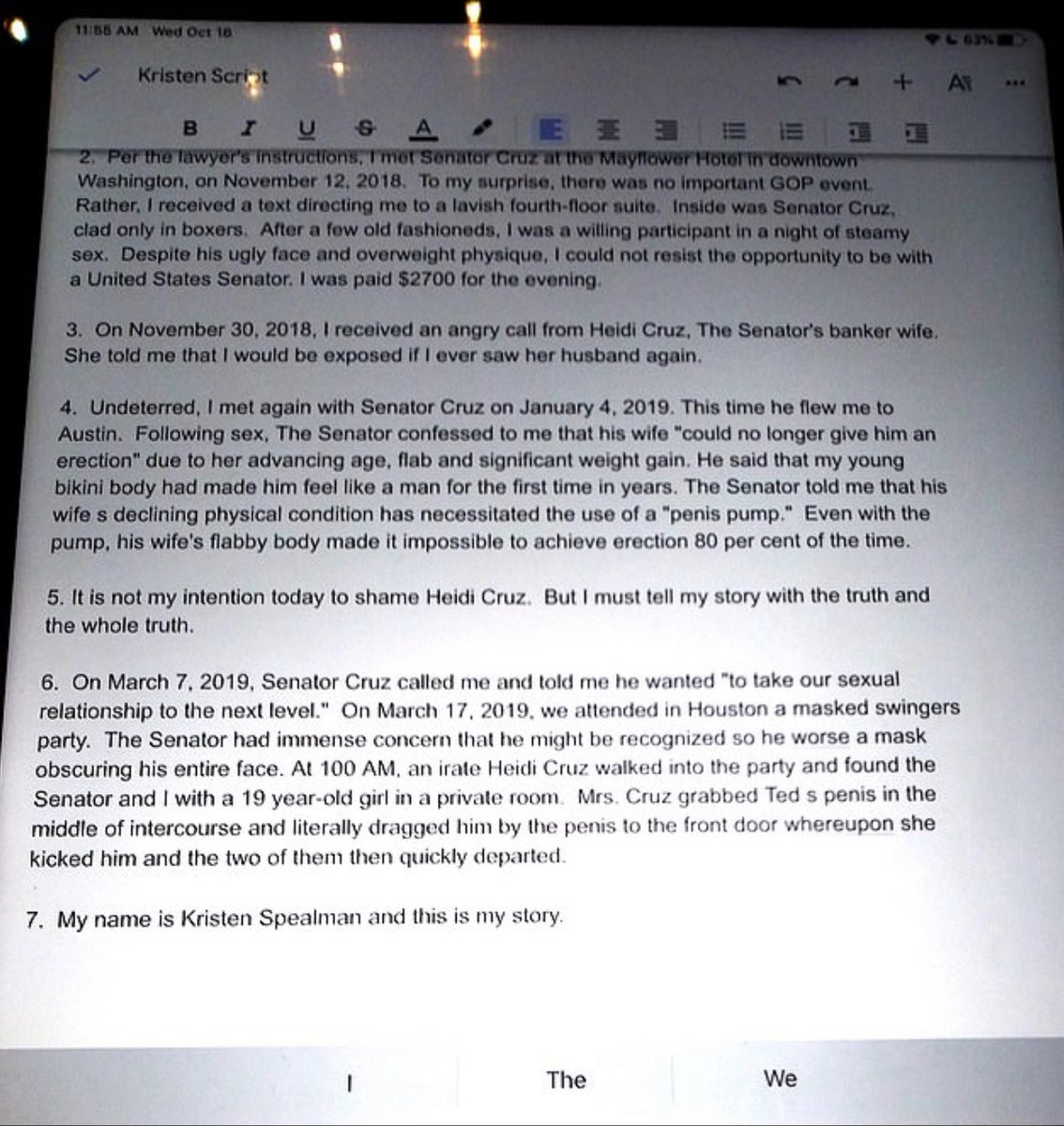Spealman claimed Wohl and Burkman also asked her to make a public statement claiming to have had an affair with Senator Ted Cruz. She provided the script to the Daily Mail. The pair of lobbyists have also tried to smear Nancy Pelosi, Robert Mueller and others.