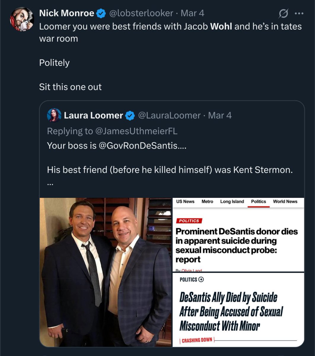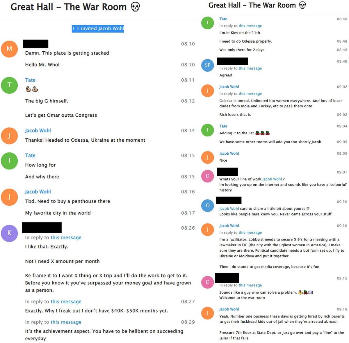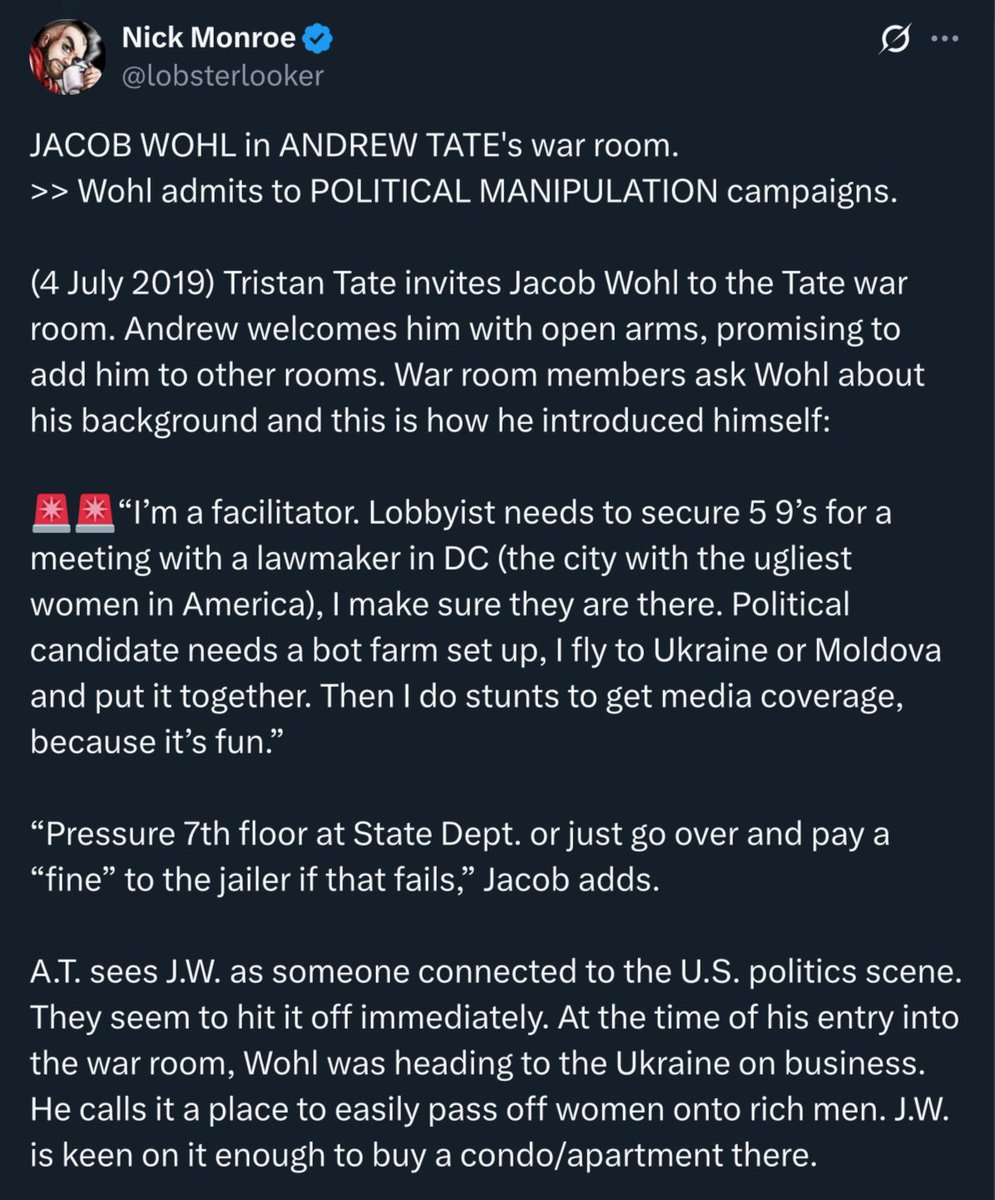 Investigative journalist Nick Monroe (@lobsterlooker) uncovered evidence of Jacob Wohl’s membership in the Tate brothers’ War Room, a private chat where Wohl boasted of his political manipulation campaigns. Monroe also connects Wohl to “conservative” activist Laura Loomer.