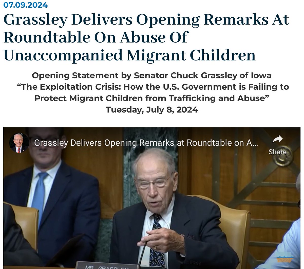 🧵 On July 9, 2024, Sens. Grassley, Cassidy and Ron Johnson held a roundtable on “The Exploitation Crisis: How the U.S. Government is Failing to Protect Migrant Children from Trafficking and Abuse.” Tara Rodas, Deborah White, Shevaun Harris & Dr. Jarrod Sadulsky testified.