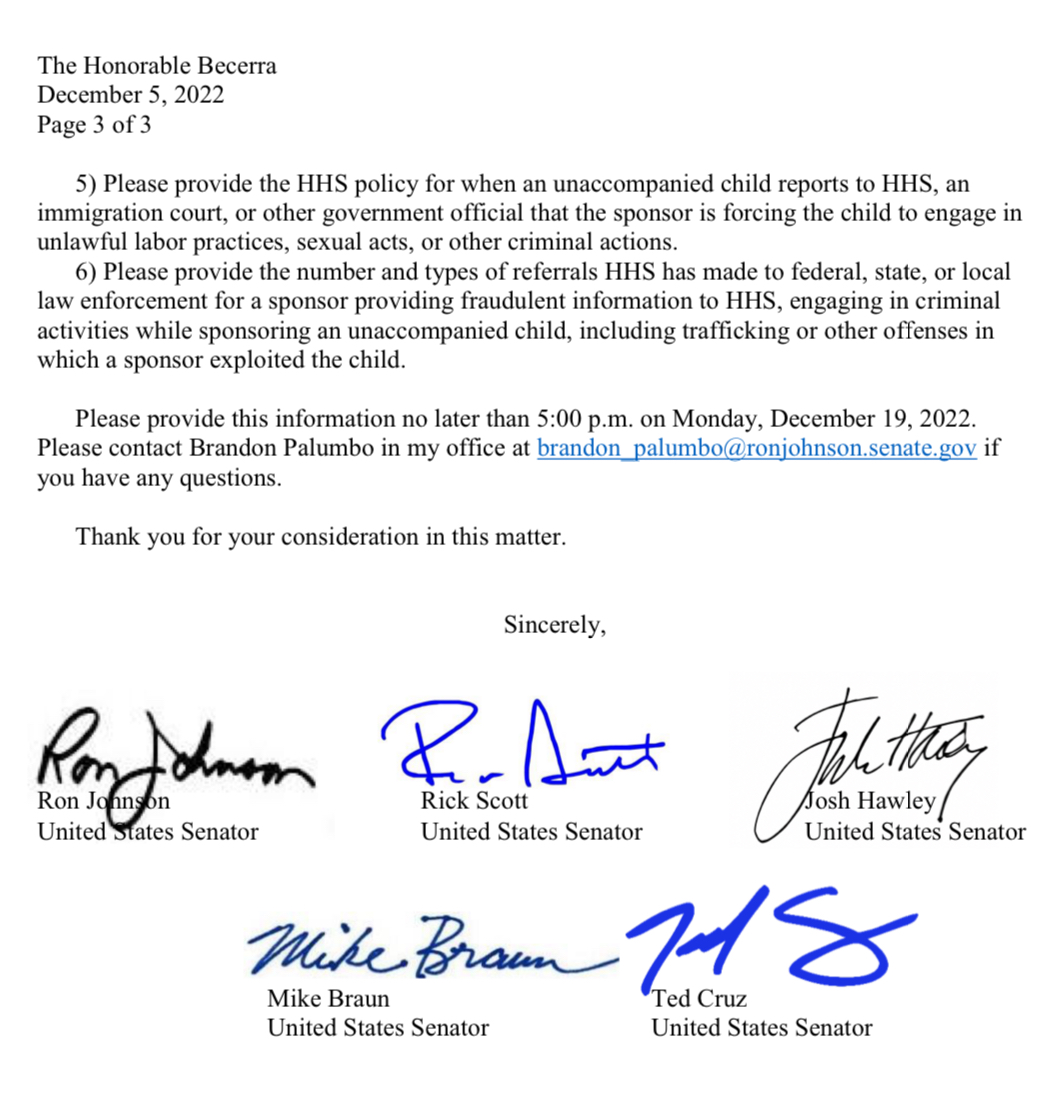 JOHNSON: A few days after that, I wrote a letter, joined by four colleagues, to @HHSGov @SecBecerra. “We write concerning an alarming report by a federal employee whistleblower that the Department of Health and Human Services is knowingly transferring unaccompanied migrant children in the custody of criminals, including sex traffickers. “If these claims are true,” we wrote — we certainly know they are true — “this is pure evil being committed by your agency. This cannot be swept under the rug. The American public must know the truth about what is happening to these victims of the Biden administration’s inhumane open border policies.” We wrote that letter December 5, 2022. Now, you would think, with the revelations of that whistleblower interview by Project Veritas, with a letter from five U.S. senators expressing concern about what is happening to children — unaccompanied minors! — being taken into custody by U.S. agency officials, you would think the secretary of HHS would jump on that, investigate this and clean it up. He didn’t even respond to our letter. That’s what we’re dealing with here. We’re talking about total neglect.