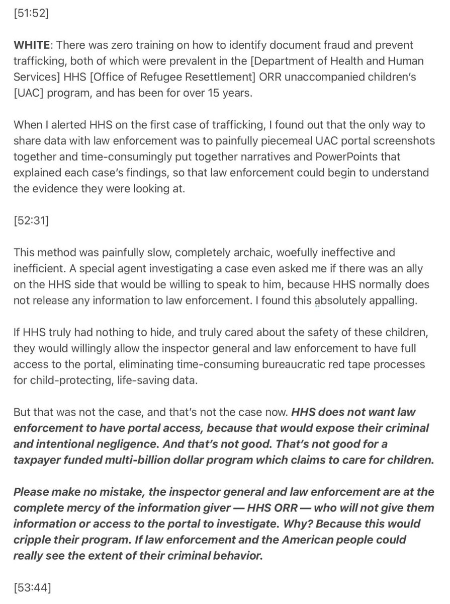 WHITE: No document fraud training. No trafficking training. No sponsor vetting training. Nothing. That’s why there was complete and utter chaos in the case management division. And that’s why children ended up in the hands of traffickers. One could argue that this many pervasive failures could only be the product of system by design. HHS knows there is zero accountability once the children leave their facility, which is why speed is consistently prevailing over safety.