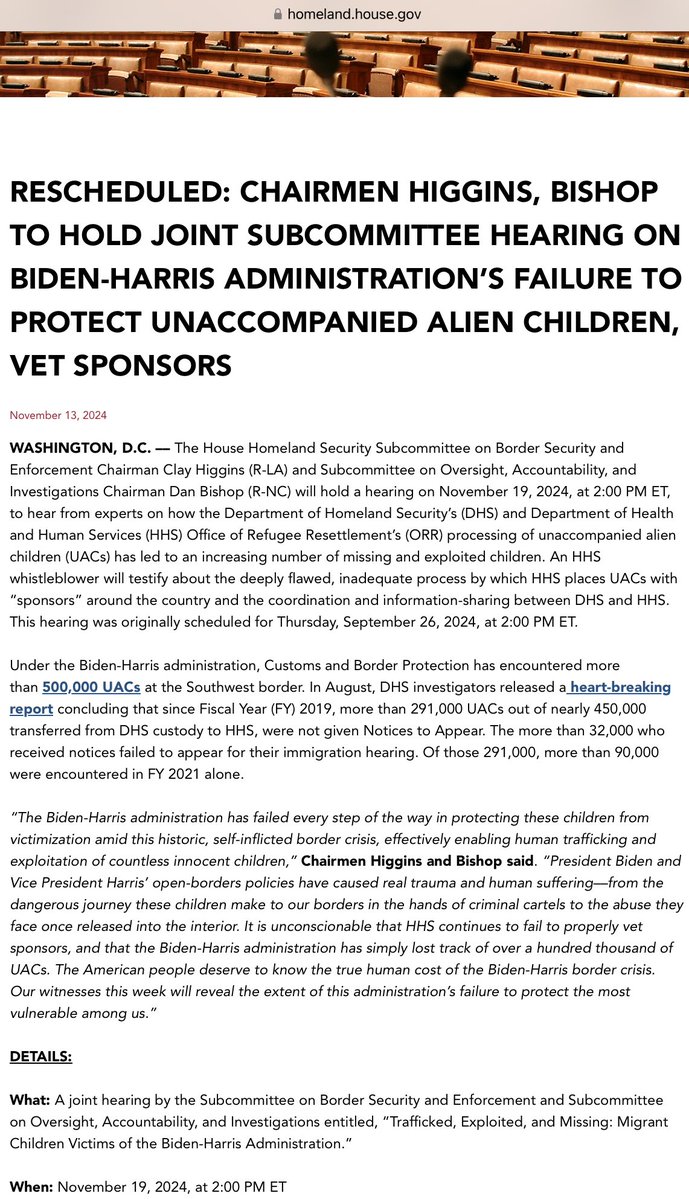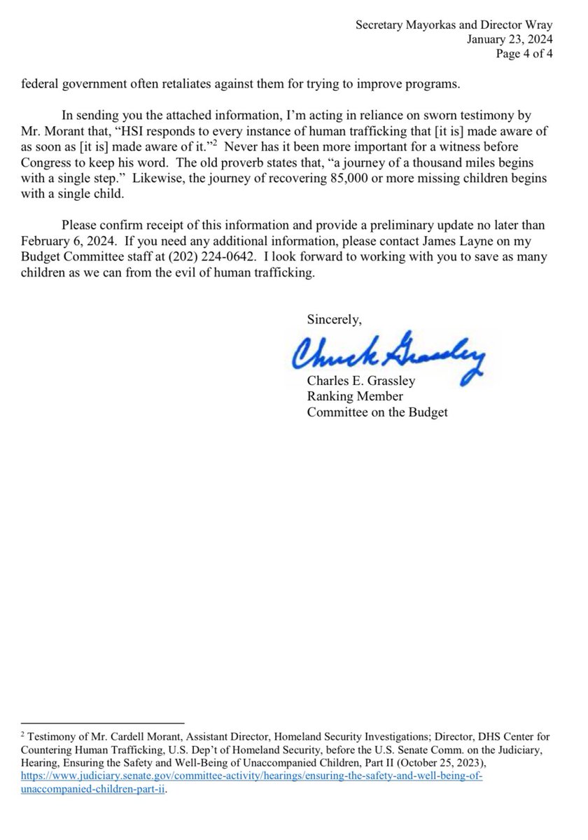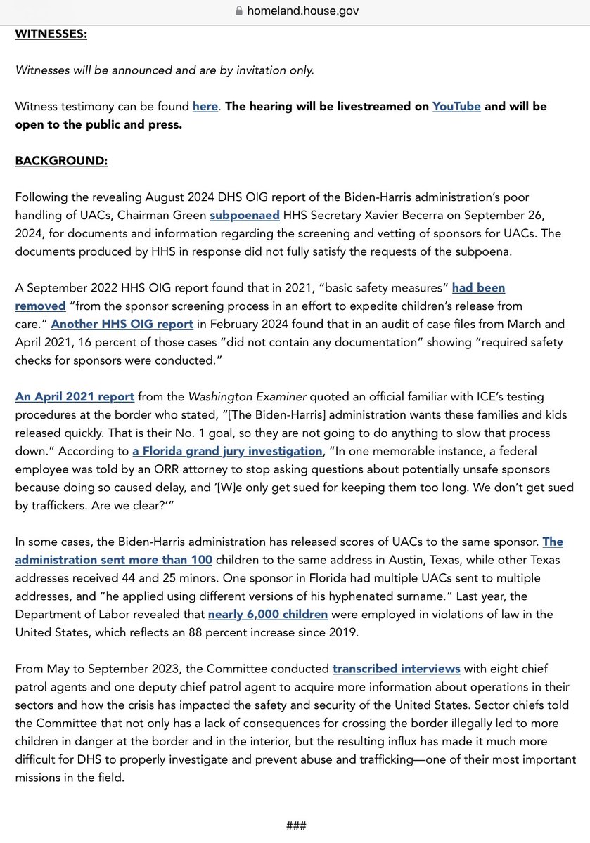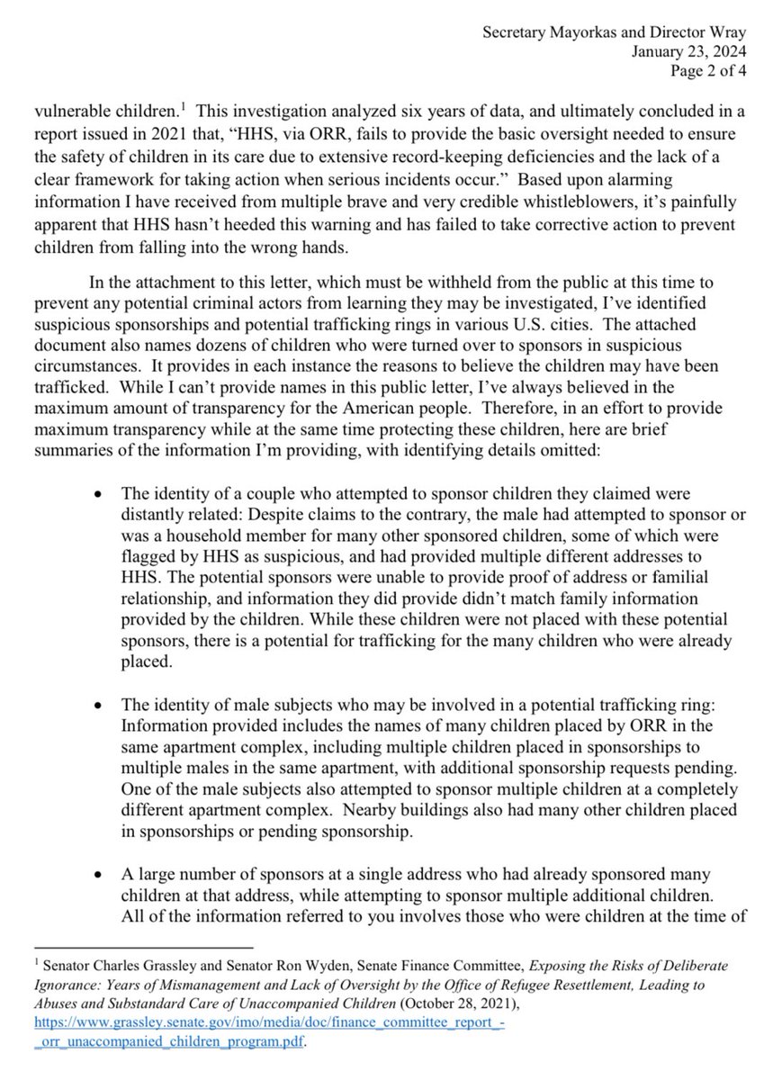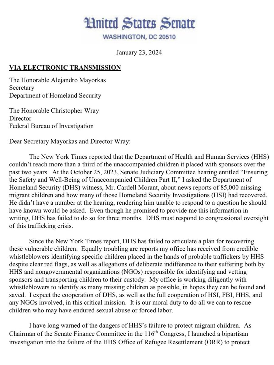 GRASSLEY: Biden has literally lost over 85,000 kids. Through congressional oversight, we’re trying to hold the executive branch accountable. HHS is endangering these vulnerable children in many ways. Opening Statement: https://www.grassley.senate.gov/news/remarks/grassley-delivers-opening-remarks-at-roundtable-on-abuse-of-unaccompanied-migrant-children