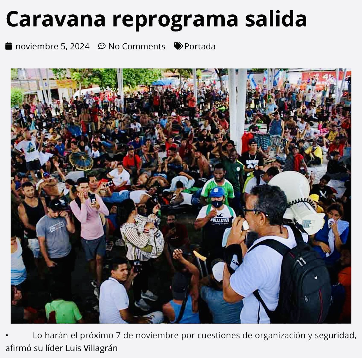 🔥José Cancino, Diario de Chiapas, November 5, 2024 CARAVAN RESCHEDULES DEPARTURE The migrant caravan announced to leave in the early hours of this Tuesday, November 5 from Tuxtla Gutiérrez, decided to wait more days and reschedule the walk for next November 7, due to insecurity situations that keep the more than 1,500 foreigners who signed up to participate fearful. According to activist Luis García Villagrán, this Monday afternoon they met to determine that there are no conditions to walk from the state capital to the municipality of Arriaga, where they would meet with the other contingent that does walk from Tapachula at 6:00 a.m. ”There is fear among migrants because in the WhatsApp group where we are concentrated, human traffickers have infiltrated and have begun to frighten everyone, so we still cannot leave and we must organize ourselves more,” said the human rights defender. He explained that he regrets that the group in the center of the State cannot leave, just on the day that the United States elects a new president, but the group's safety comes first rather than risking it on the road and on a complicated route to the border with Oaxaca. The migrants are expected to gather from Monday night and early Tuesday morning in the vicinity of the central park of Tuxtla, with the purpose of walking towards La Pochota and then traveling along the entire highway towards Ocozocoautla. Afterwards, they will do so towards the municipality of Arriaga, where many other foreigners are already waiting to join the two groups.