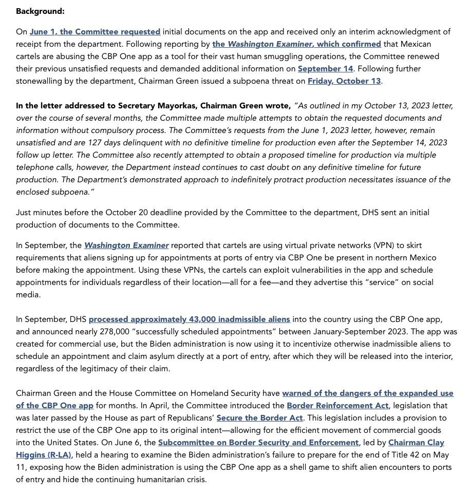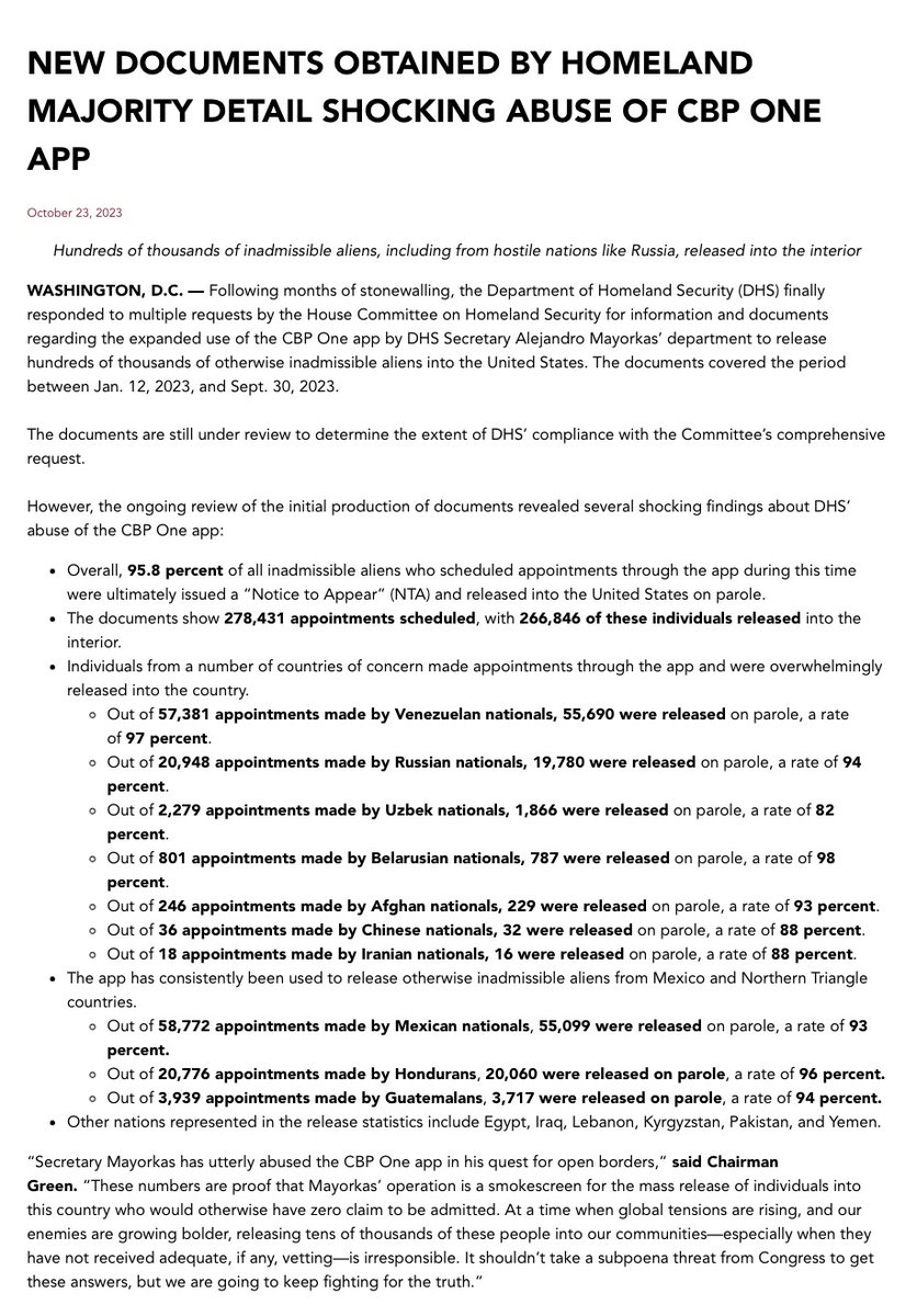 House Homeland Security Committee Majority: New Documents Detail Shocking Abuse of #CBPOne App Hundreds of thousands of inadmissible aliens, including from hostile nations like Russia, released into the U.S. interior 👉🏼https://homeland.house.gov/2023/10/23/new-documents-obtained-by-homeland-majority-detail-shocking-abuse-of-cbp-one-app/