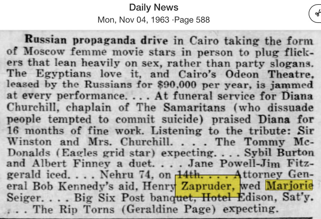Fun fact: Weeks before JFK was assassinated, the wedding of Abraham Zapruder’s son Henry was announced in the NY Daily News. “Attorney General Bob Kennedy’s aid, Henry Zapruder, wed Marjorie Seiger.” Is it generally known that Henry Zapruder worked for RFK? 🤔