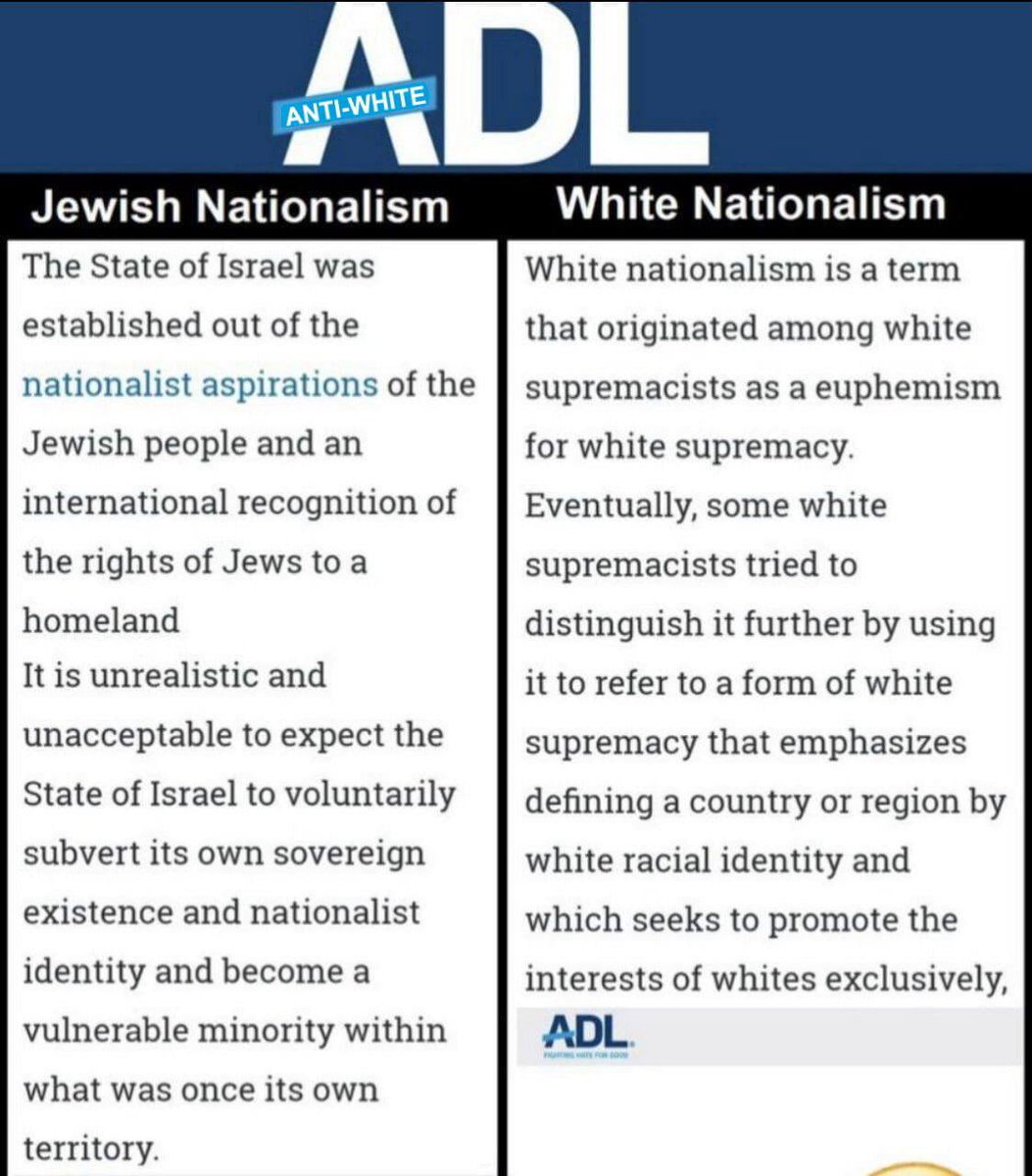 The ADL advocates for #antiwhite left-wing values in the West, but fanatically supports nationalism and right/-wing values in Israel. https://t.co/IhoN1aiVgc