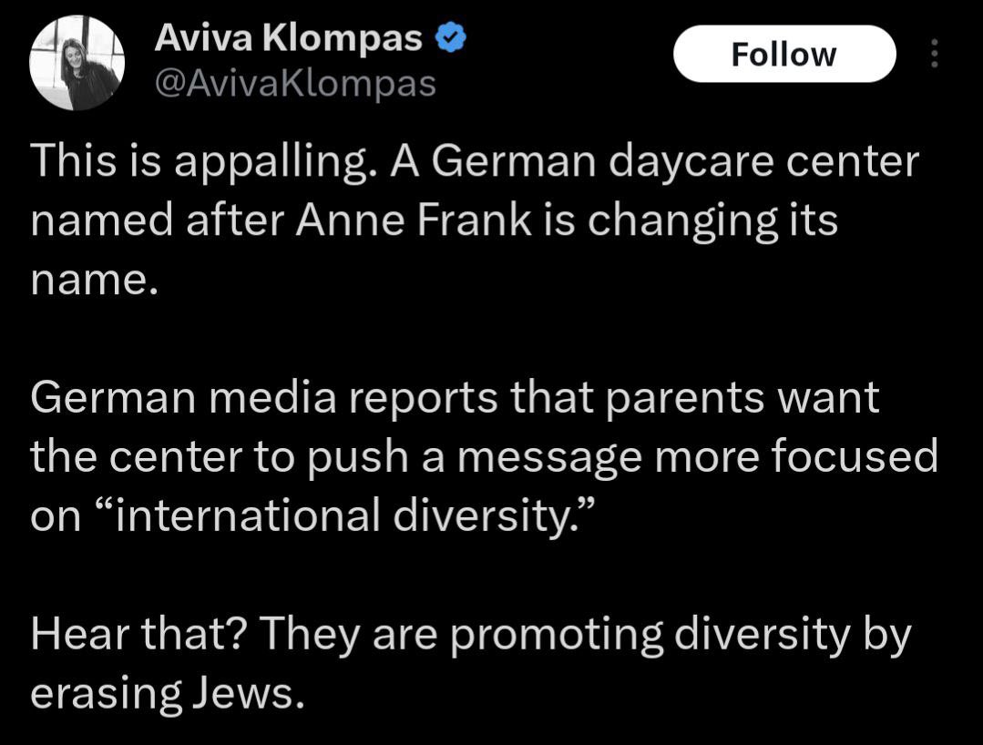 Germany: —Jewish residents ‘outraged’ after a daycare center named after Anne Frank changes its name The daycare told media it’s changing the name to something more focused on ‘international diversity’. Jewish residents say they feel ‘betrayed’ and are being erased in the name of diversity.