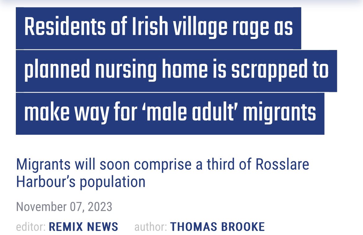 Ireland: —Irish government turns planned nursing homes in a small village into migrant house for 400 male migrants The Irish are not happy. Imported fighting-age men will soon comprise a third of Rosslare Harbour’s population The Irish did not suffer and die to have their country given away.