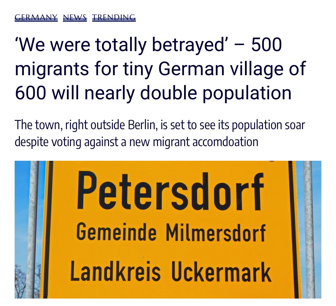 Germany: A tiny German village of 600 residents will receive 500 immigrants despite voting against it The local residents are outraged, alienated, and feel helpless: “We were totally betrayed” Over night this village will see their population nearly doubled despite democratically voting against it.