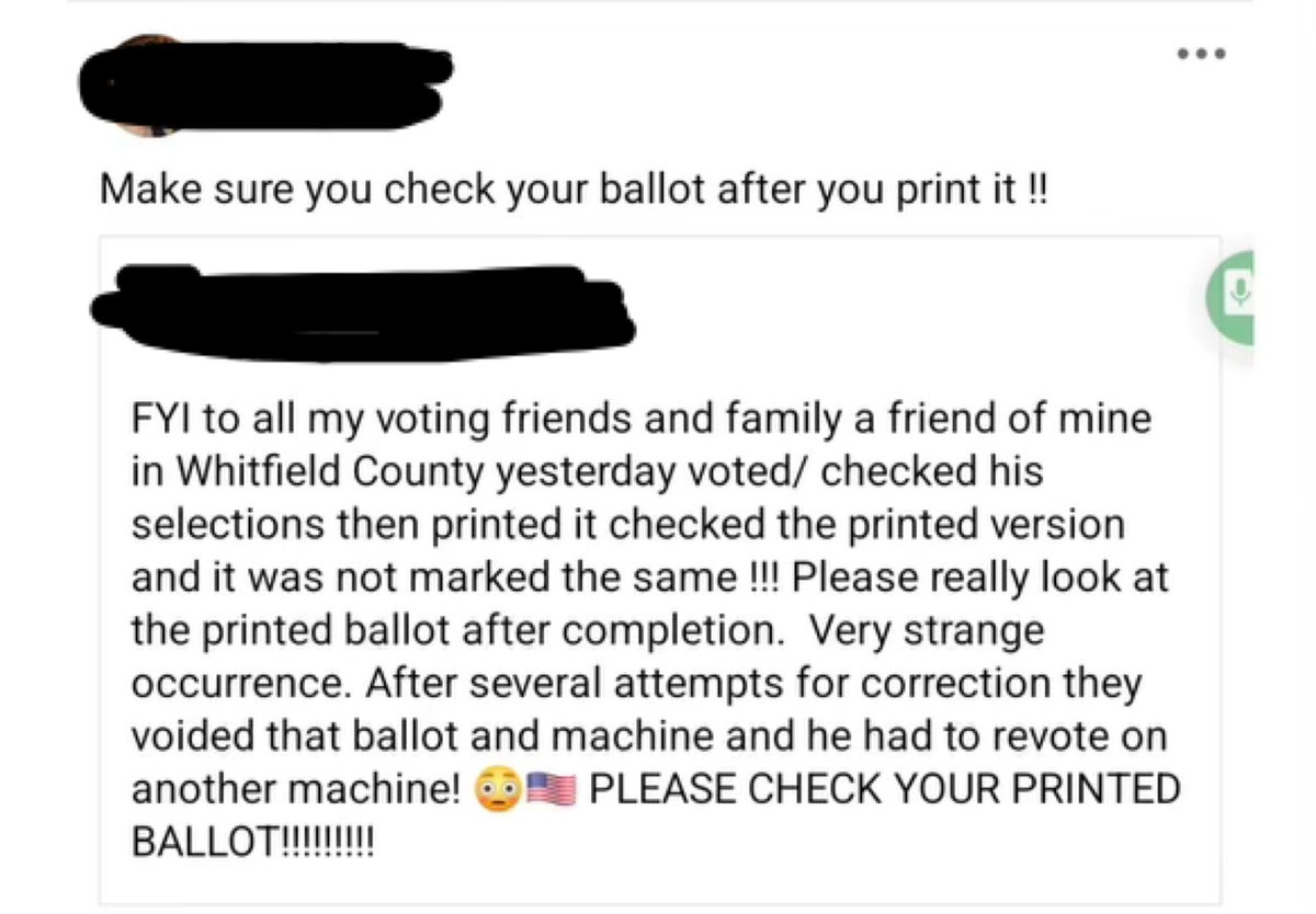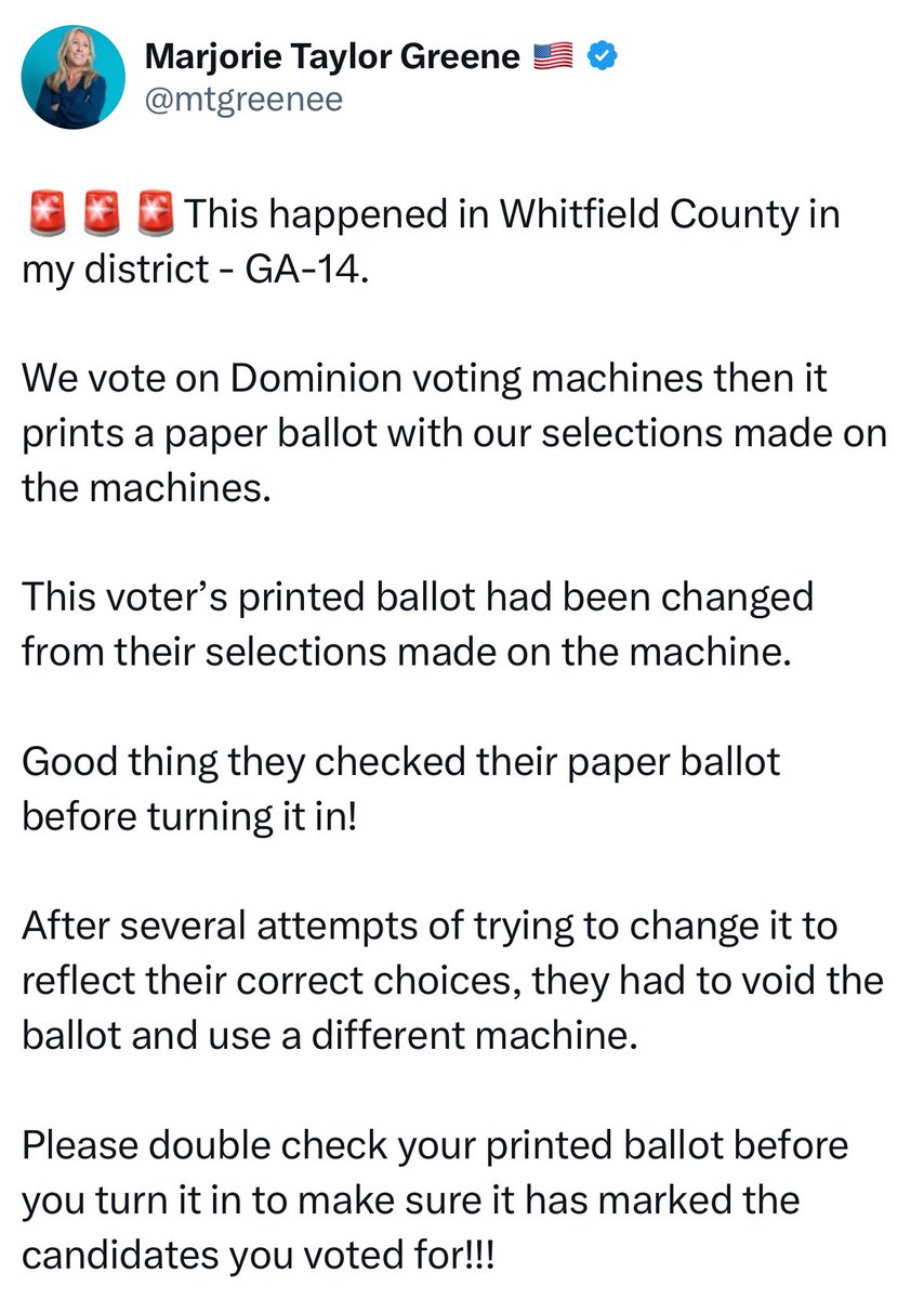 ๐จGEORGIA ELECTION FRAUD๐จ Dominion voting machines. We are already seeing MAJOR issues with the machines across the Peach State as early voting is underway Congresswoman MTG confirmed there is an issue in her district (14th) with the machines flipping votes from Trump to Kamala A voter chose Trump on the BMD (ballot marking device) & then when the printed ballot came out of the table top printer (before it was scanned to actually cast the ballot), the text showed they selected Kamala After several attempts to fix it, they finally had to void out the ballot, use another machine and start fresh. They were able to successfully select Trump and it correctly showed on the printed ballot text. The ballot was then cast by scanning the printed ballot in the Polling Place Scanner (tabulator) A picture of a Fulton County ballot from 2020 is shown below so you can see how a printed ballot looks after selections are made (picture from Google) Voters across Georgia are now being told to double check the printed ballot, before it is scanned into the tabulator, to make sure the correct selections are shown in the text on the printed ballot, which is below the QR code that is also printed on the ballot However, I want to know what difference does it make what the printed text on the ballot shows when the tabulator is only reading the QR code, not the text on the printed ballot????? To those who may not be familiar with how the process works, selections are privately made on a BMD (ballot marking device aka touch screen tablet) and then are printed out on a table top printer. Each printed ballot shows a QR code on top and below it are the selections in text. The printed ballot is then scanned into the Polling Place Scanner (aka tabulator) where the QR code is read and tallies and then the process is complete The Polling Place Scanner only scans the QR code, which is NOT readable by the human eye. The QR code also cannot be read by any other device other than the Polling Place Scanner. Itโs NOT like what weโre accustomed to with QR codes being easily scanned by our phones in our everyday lives So it DOES NOT MATTER what the text on the printed ballot states because the machine is not reading that, it is ONLY reading the QR code How do we know that this voter who had issues with their vote being switched, that was identified in the text portion of the printed ballot, is also not having this same issue with the QR code? There is literally NO WAY for anyone to verify what the QR code will be read as This is beyond disturbing as Governor Kemp, SOS Raffensperger, AG Chris Carr and the Georgia State Legislature had four years to secure our elections after all of the issues that happened with Dominion in 2020 and they chose NOT to do a damn thing I have been sounding the alarm bells that although Trump is overwhelmingly winning in the State of Georgia, nothing of substance has been done on election integrity, so we are being set up for a repeat of 2020 for a stolen election How does anyone that already cast their ballot know that their vote wasnโt switched, if they didnโt double check their printed ballot text, before feeding it into the tabulator? How does anyone know that even if the printed ballot text is correct, that the QR code is correct? How does anyone know anything, except for Dominion employees? Isnโt it our right as citizens to be able to ensure we are voting the way we intend? We are in BIG TROUBLE in Georgia & DJTโs path back to the White House depends on the Peach State The ONLY option at this point to ensure voters in Georgia have a secure, free & fair election is by declaring a State of Emergency to get rid of the machines and go to hand-marked, hand-counted paper ballots We are only on day four of early voting, with 17 more days to go, before Election Day. Buckle up because the powers that be have shown they will do ANYTHING to stop Trump & it seems they are just getting started