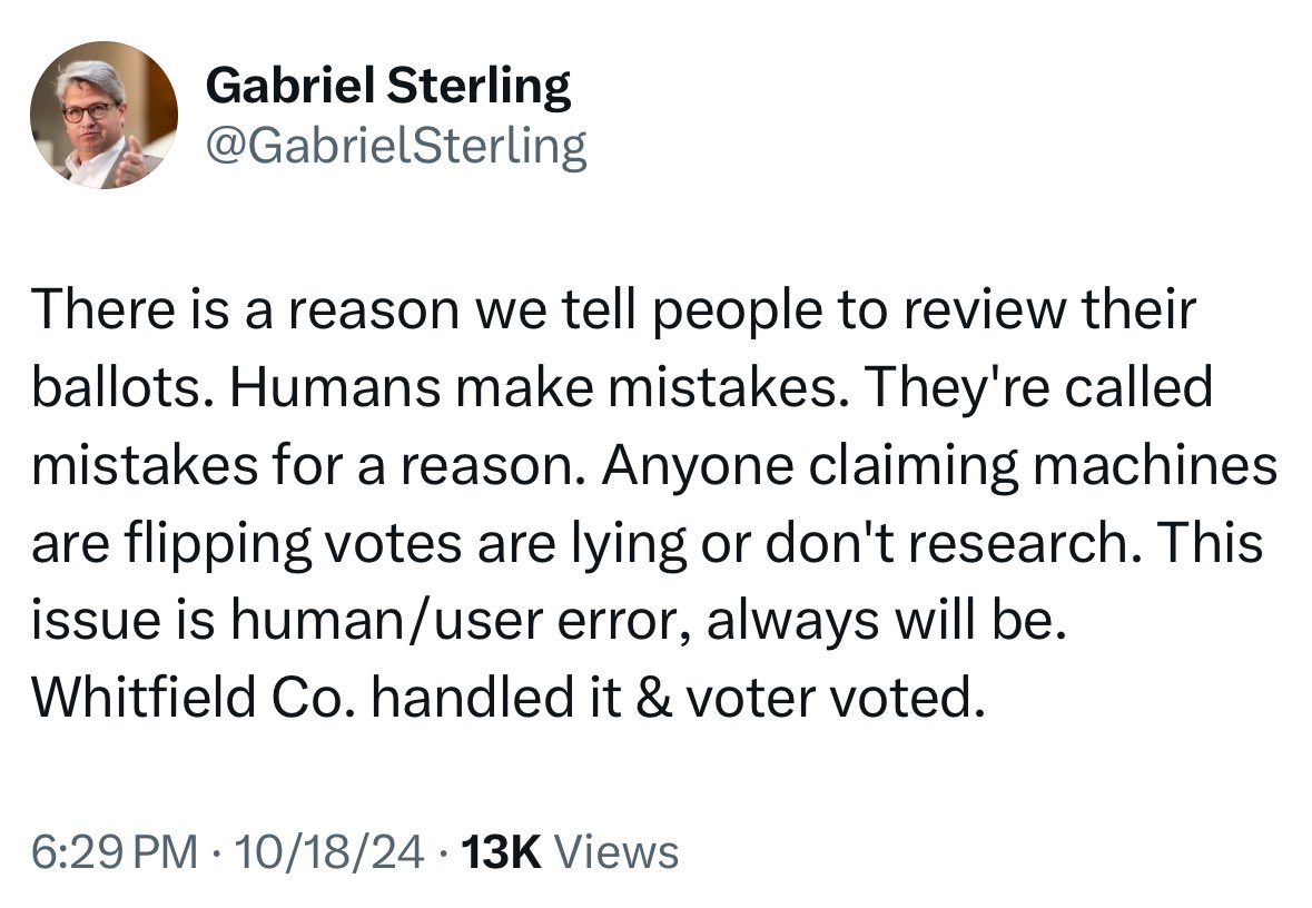 Oh look, GA SOS COO @GabrielSterling already gaslighting Georgians that there is NO PROBLEM Nothing to see here folks ๐ Just machines flipping votes & no one being able to verify who they are voting for because of the QR code, that is unable to be read by the human eye https://t.co/2oOp6MLsr8