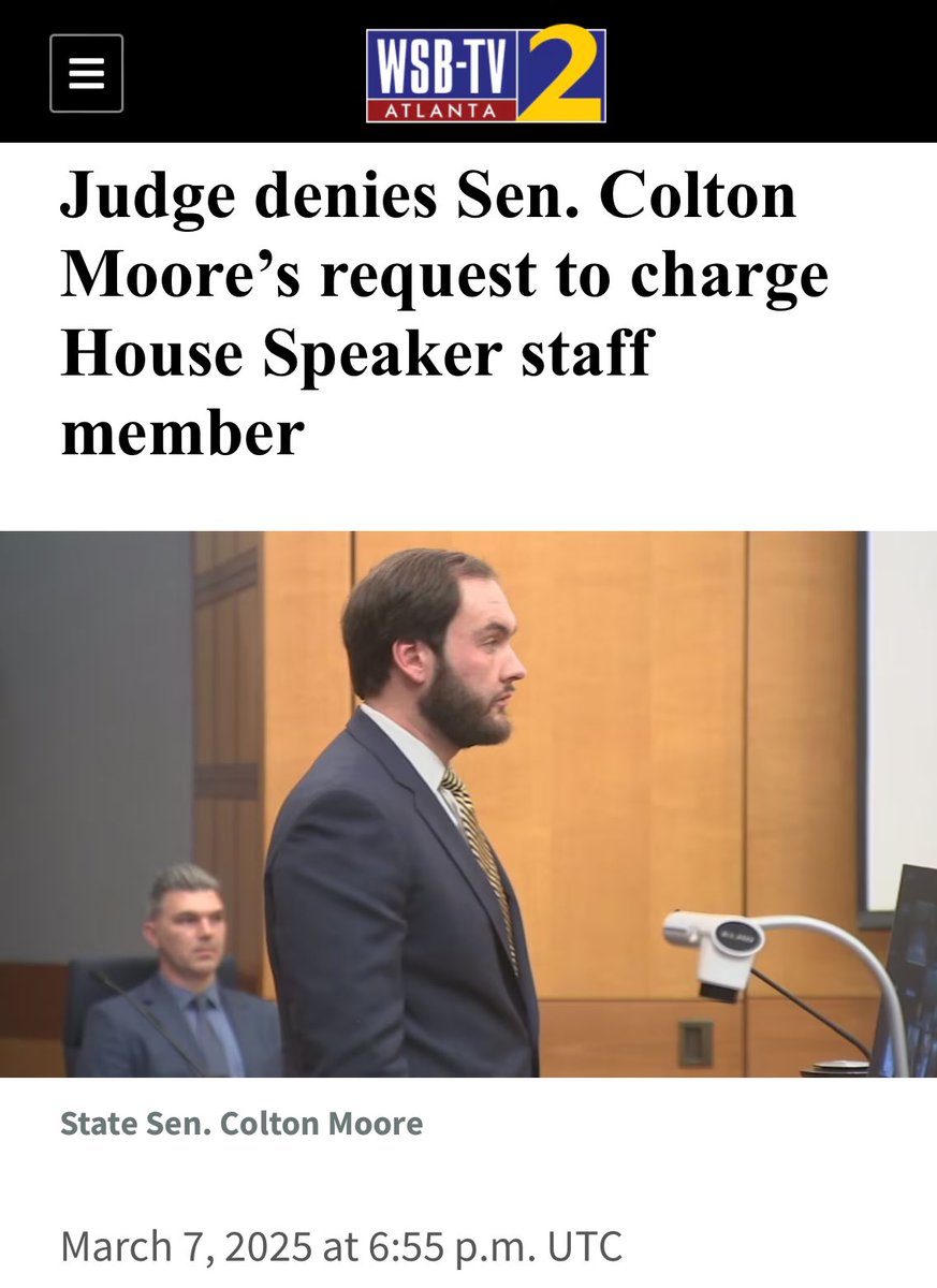 ๐จBREAKING NEWS: GEORGIA A Fulton County Judge has just denied the request to charge Georgia Speaker of the House Jon Burnsโ staffer, Keith Williams, with assault. Judge Robert Wolf ruled that Senator Colton Moore did not provide sufficient evidence to charge Keith Williams with assault, despite it being caught on video. The assault took place under the Gold Dome when the Georgia State Legislature was holding a Joint Session & Speaker Jon Burnsโ unconstitutionally denied State Senator Moore entry. Following the assault, Georgia Capitol Police arrested Senator Colton Moore on January 16 when he tried to enter the chamber. Speaker Burns had barred Senator Moore from the chamber because of statements he made about the late House Speaker David Ralston. Yes, you read that correctly. Speaker Burns denied Senator Moore entry because he didnโt like his statements against a dead Speaker of the House. This is another win for the establishment. This is a result of the Kemp Cabal running Georgia like the mafia. The GAGOP, under the current Chairmanโs leadership, also ran cover for Speaker Burns Officeโs actions against Senator Moore, refusing to call the Speaker out while trying to gaslight everyone by pretending to stand with Senator Moore. Still to this day, they are still running cover for Speaker Burns. A precedent has been set that it is okay to deny a duly elected member of the Georgia Legislature entry to session & assault them in the process. A precedent has been set that if the Speaker of the House doesnโt like a duly elected Senatorโs words regarding a former deceased Speaker, 200,000 citizens in NW Georgia do not deserve representation in the State House. If this were a Democrat, everyone would be raising hell but because this is a MAGA Trump supporter, everyone is silent. Where the hell is the outrage? This is egregious! Despite President Donald Trump being elected in November 2024, Trump supporters are being assaulted, ostracized, etc & no one is even batting an eye. We desperately need help from the DOJ in Georgia @PamBondi @FBIDirectorKash @TheJusticeDept @EagleEdMartin While the DOJ may not have jurisdiction directly over the assault at the Georgia Capitol, this incident is a direct result of Georgiaโs corrupt elections. The DOJ needs to come in & get to the bottom of everything that has happened surrounding Georgiaโs elections, including 2020 & the car explosion which Governor Kempโs daughterโs boyfriend, Harrison Deal, died. Trump was damaged by 2020 but we rectified that by sending him back to the White House in 2024. However, the damage from 2020 on a state & local level has never been addressed & average Americans are still suffering. This state is beyond anything I have ever seen & with Governor Kemp at the helm, Georgia citizens are gravely suffering. This is an SOS!!!!
