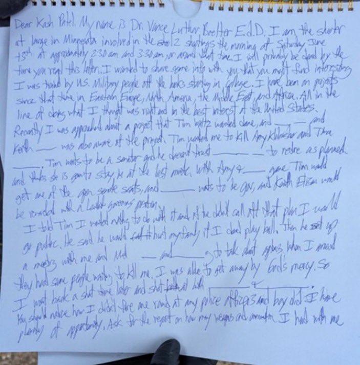 JUST IN: The confession letter written by Minnesota shooter Vance Boelter has been released. He wrote the letter to @Kash_Patel. In the letter, he said, “Tim Walz @Tim_Walz wanted me to KlLL Amy Klobuchar…” “Tim Wants to be a Senator...” This is a very detail oriented letter. I hope the FBI investigates Tim Walz.