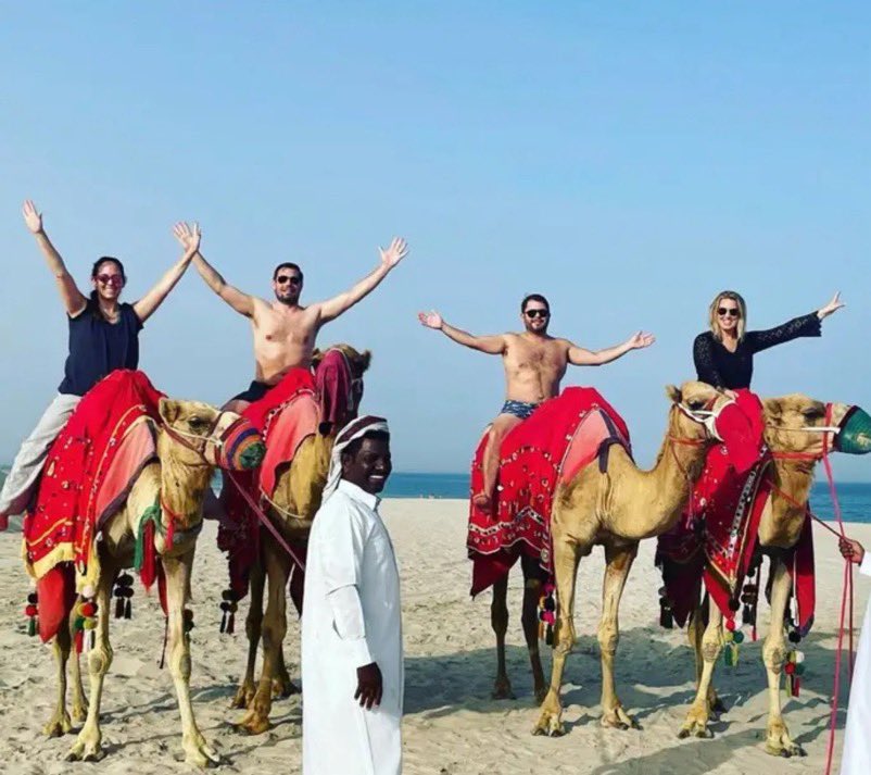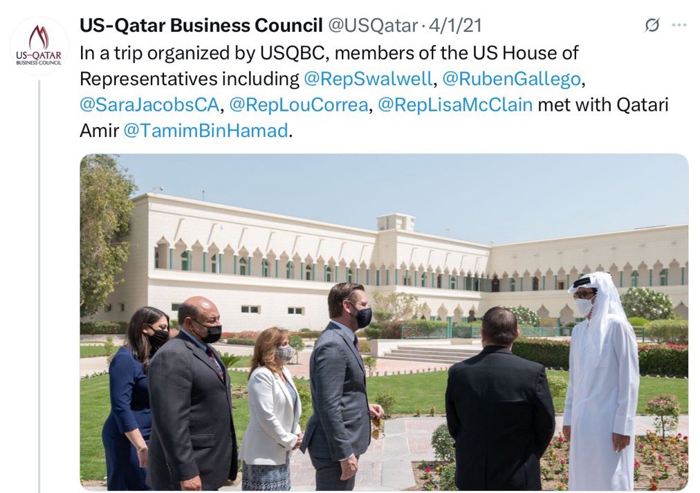Here’s the photo from @RepLisaMcClain’s trip to Qatar. McClain was accompanied on the trip by Reps. Eric Swalwell (D-CA) @RepSwalwell, Ruben Gallego (D-AZ) @RubenGallego, Lou Correa (D-CA) @RepLouCorrea, and Sara Jacobs (D-CA) @RepSaraJacobs, along with some spouses, including Ruben Gallego’s lobbyist wife, Sidney Barron who he cheated on his 9 month pregnant wife with. Look how much these people hate you. Why is the GOP Conference Chair leaking memos to Qatar and taking photos on camels in Qatar with shirtless Reps. @RubenGallego and @RepSwalwell? No wonder why the GOP won’t crack down on the Muslim Brotherhood. The GOP Conference Chair @RepLisaMcClain is literally on the take from jihadists in suits. She spent Independence Day with a bunch of subversive Muslims from Qatar at the Spy Museum. Literally throwing the Islamic subversion in our faces. She must resign.