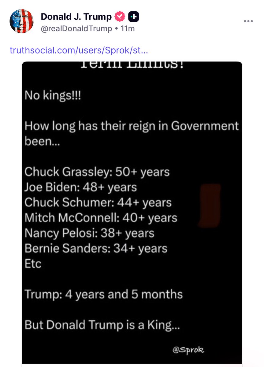 President Trump just posted this on Truth Social, advocating for term limits of uniparty politicians who have been in office for over 30 years. This further exposes the insanity of the radical left’s “No Kings” movement. Congress is just hospice with better amenities. https://t.co/xrN9z576p3