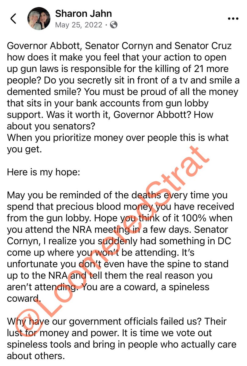 NEW: The mother of Joshua Jahn, the radical Left shooter who tried to assassinate ICE @ICEgov agents in Dallas, Texas today, but instead ended up killing several illegal alien detainees, is named Sharon Jahn. She is a Democrat who makes social media posts attacking elected Texas Republican lawmakers who support the Second Amendment. Ironic since her son used a gun to try to assassinate ICE agents and then blew his own brains out. Just another example of FAILED Democrat parenting. Joshua Jahn is a radical Leftist with a Democrat mother who spews her hatred on social media. She has made several posts on Facebook attacking pro-second Amendment Texas Republicans like @tedcruz and @GregAbbott_TX. In one post she posted on Facebook on May 25, 2022, the shooter’s mother said, “Governor Abbott, Senator Cornyn and Senator Cruz how does it make you feel that your action to open up gun laws is responsible for the killing of 21 more people? Do you secretly sit in front of a tv and smile a demented smile? You must be proud of all the money that sits in your bank accounts from gun lobby support. Was it worth it, Governor Abbott? How about you senators? When you prioritize money over people this is what you get. Here is my hope: May you be reminded of the deaths every time you spend that precious blood money you have received from the gun lobby. Hope you think of it 100% when you attend the NRA meeting in a few days. Senator Cornyn, I realize you suddenly had something in DC come up where you won't be attending. It's unfortunate you don't even have the spine to stand up to the NRA and tell them the real reason you aren't attending. You are a coward, a spineless coward. Why have our government officials failed us? Their lust for money and power. It is time we vote out spineless tools and bring in people who actually care about others.” Joshua Jahn is a product of failed Democrat parenting and the Radical Left. RECEIPTS 👇🏻@DHSgov @FBI