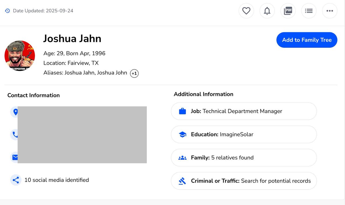 NEW: I did a background check on Joshua Jahn, the ICE shooter in Dallas, Texas. Joshua Jahn's profile picture from his now-wiped Facebook page per the background check results reveals ANTIFA and communist imagery. The profile photo is of an armed communist with the hammer and sickle. The text reads GLORIOUS EXPOSITION, COMRADE. He also has a previous conviction for selling Marijuana. Proof this was Leftist political violence against ICE officers. @ICEgov @DHSgov @TriciaOhio See screenshots below 👇🏻