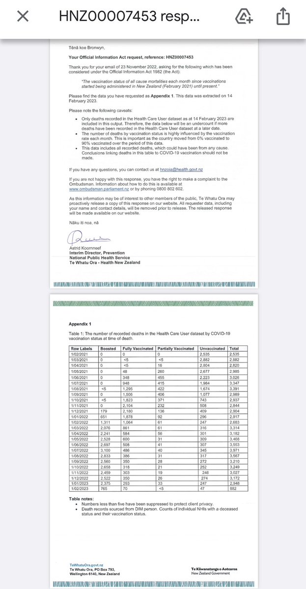 Tout d'abord, je vous montre le courrier reçu par @Bronwyn_Meikle suite à son e-mail "Official Information Act Request" du 23 novembre 2022. Ils ont extrait les données au 14 février 2023 : décès par statut vaccinal du 1/02/2021 au 1/02/2022 en Nouvelle-Zélande ⤵️