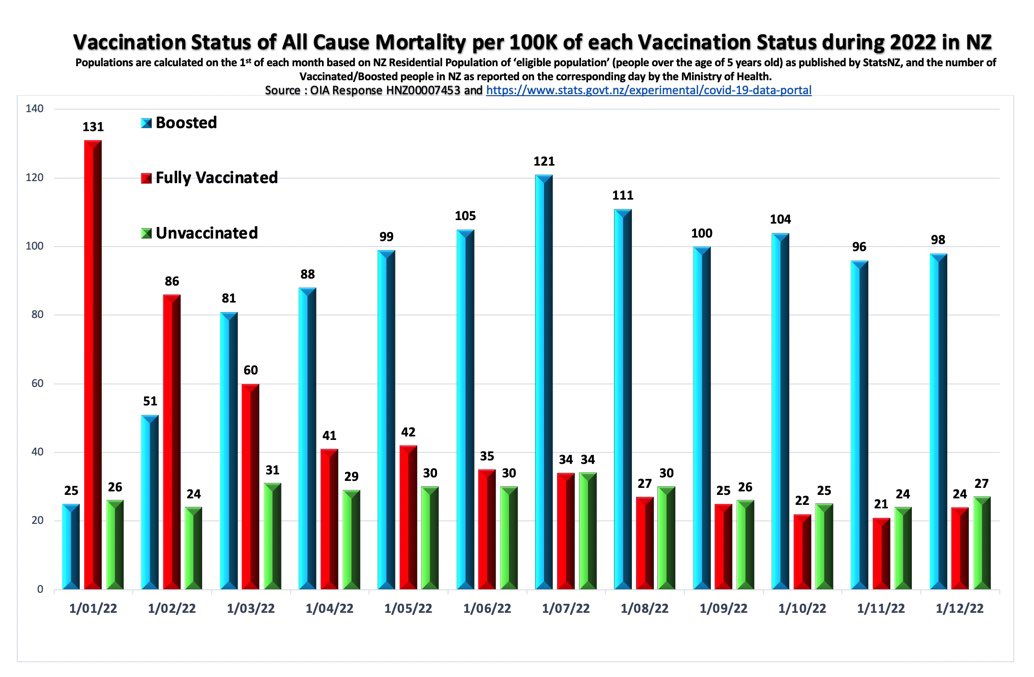 Ce graphique est incroyable. Prenons le mois de décembre 2022. Il y a 27 décès pour 100 000 non vax. 24 décès pour 100 000 2 doses. Mais 98 décès pour 100 000 3 doses. Soit 3,63 fois plus de décès chez les boostés que chez les non-injectés ! ⤵️