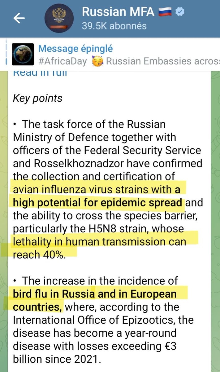 On a les détails sur leur compte Telegram. Ils ont retrouvé et confirmé la présence de souches de grippe aviaire à fort potentiel de propagation, et la capacité de se transmettre à d'autres espèces, notamment la souche H5N8 dont la léthalité chez l'Homme atteint 40% !!! ⤵️