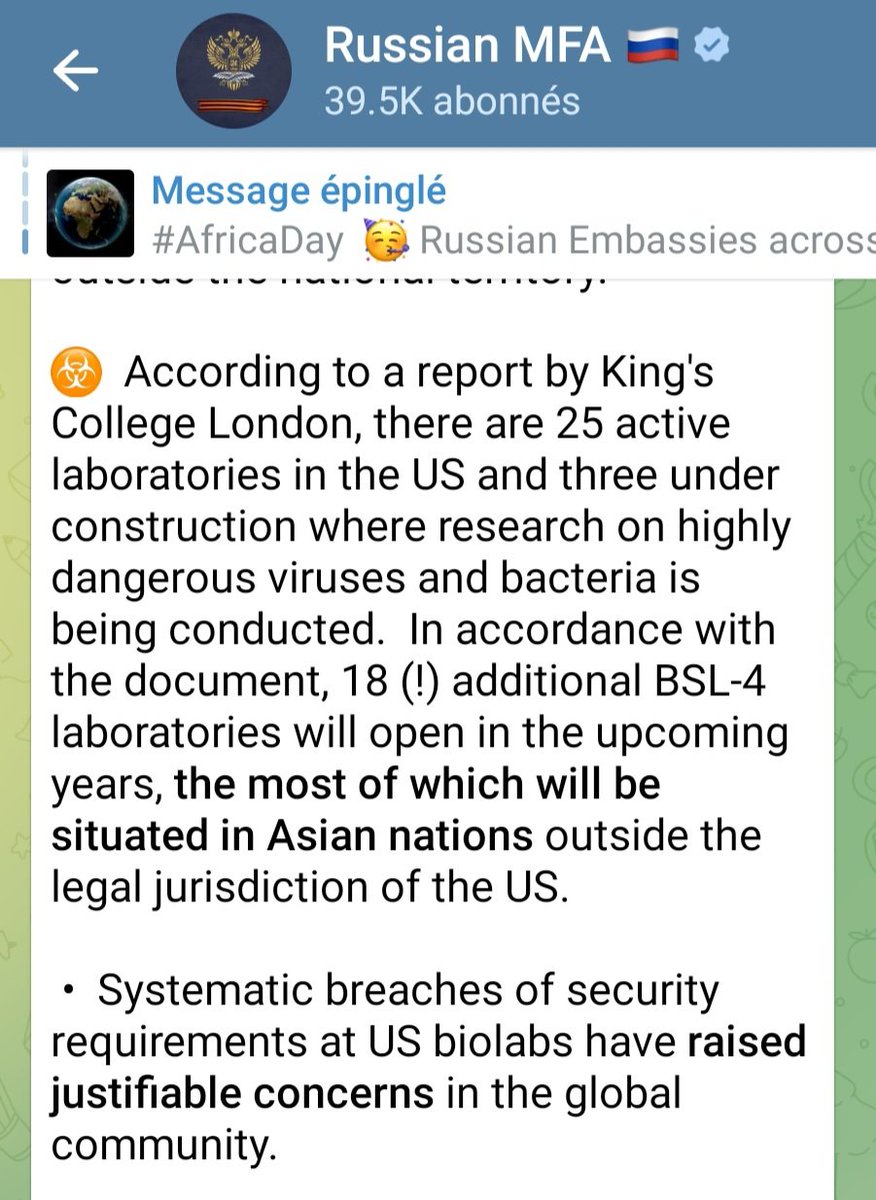 Les Russes constatent que les Américains font des recherches sur des bioweapons hautement contagieuses et pathogènes en Ukraine, juste à leur frontière, sur des gens qui sont génétiquement leurs semblables, et qu'ils font de même en Asie, sachant que la Chine est leur alliée ⤵️