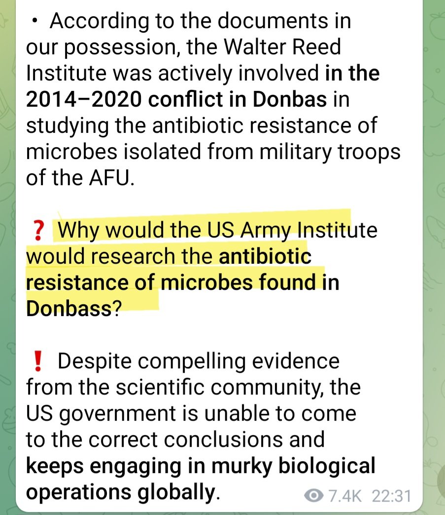 De plus, l'armée américaine a étudié l'antibiorésistance de 2014 à 2020, sur des microbes trouvés sur des militaires ukrainiens (AFU = Forces Armées Ukrainiennes) dans le Donbass 🤔 Les Russes se demandent pourquoi mener ces recherches à cet endroit précis sur des autochtones ?